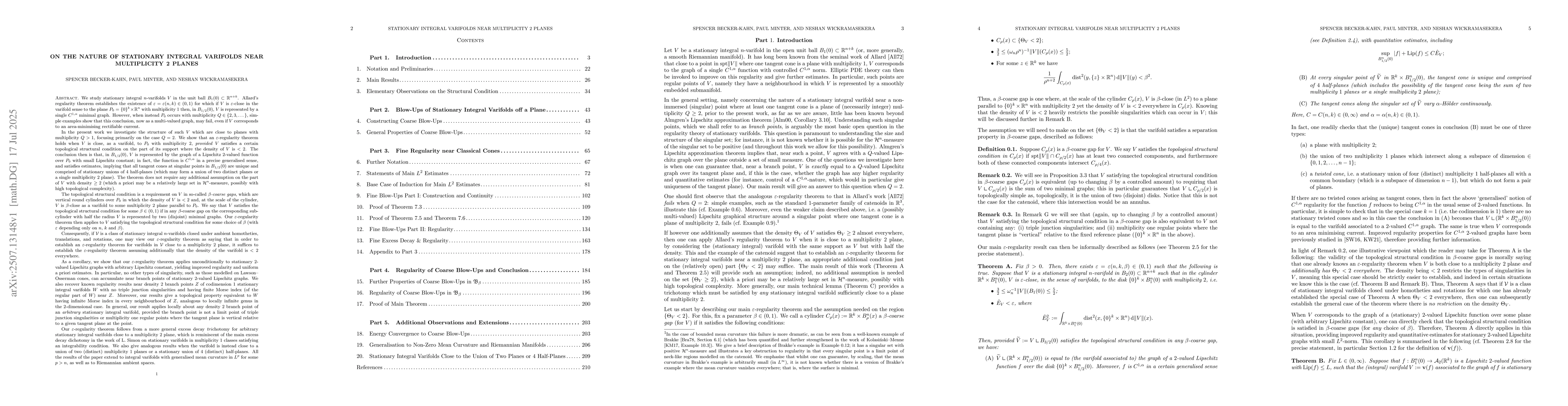 We study stationary integral $n$-varifolds $V$ in the unit ball $B_1(0)\subset\mathbb{R}^{n+k}$. Allard's regularity theorem establishes the existence of $\epsilon = \epsilon(n,k)\in (0,1)$ for which if $V$ is $\epsilon$-close (as varifolds) to the plane $P_0 = \{0\}^k\times\mathbb{R}^n$ with multiplicity 1 then, in $B_{1/2}(0)$, $V$ is represented by a single $C^{1,\alpha}$ minimal graph. However, when instead $P_0$ occurs with multiplicity $Q\in \{2,3,\dotsc\}$, simple examples show that this conclusion, now as a multi-valued graph, may fail, even if $V$ corresponds to an area-minimising rectifiable current. In the present work we investigate the structure of such $V$ which are close to planes with multiplicity $Q>1$, focusing primarily on the case $Q=2$. We show that an $\epsilon$-regularity theorem holds when $V$ is close, as a varifold, to $P_0$ with multiplicity $2$, provided $V$ satisfies a certain topological structural condition on the part of its support where the density of $V$ is $<2$. The conclusion then is that, in $B_{1/2}(0)$, $V$ is represented by the graph of a Lipschitz $2$-valued function over $P_0$ with small Lipschitz constant; in fact, the function is $C^{1,\alpha}$ in a precise generalised sense, and satisfies estimates, implying that all tangent cones at singular points in $B_{1/2}(0)$ are unique and comprised of stationary unions of $4$ half-planes (which may form a union of two distinct planes or a single multiplicity $2$ plane). The theorem does not require any additional assumption on the part of $V$ with density $\geq 2$ (which a priori may be a relatively large set in $\mathcal{H}^n$-measure with high topological complexity). As a corollary, we show that our $\epsilon$-regularity theorem applies unconditionally to stationary $2$-valued Lipschitz graphs with arbitrary Lipschitz constant, yielding improved regularity and uniform a priori estimates.