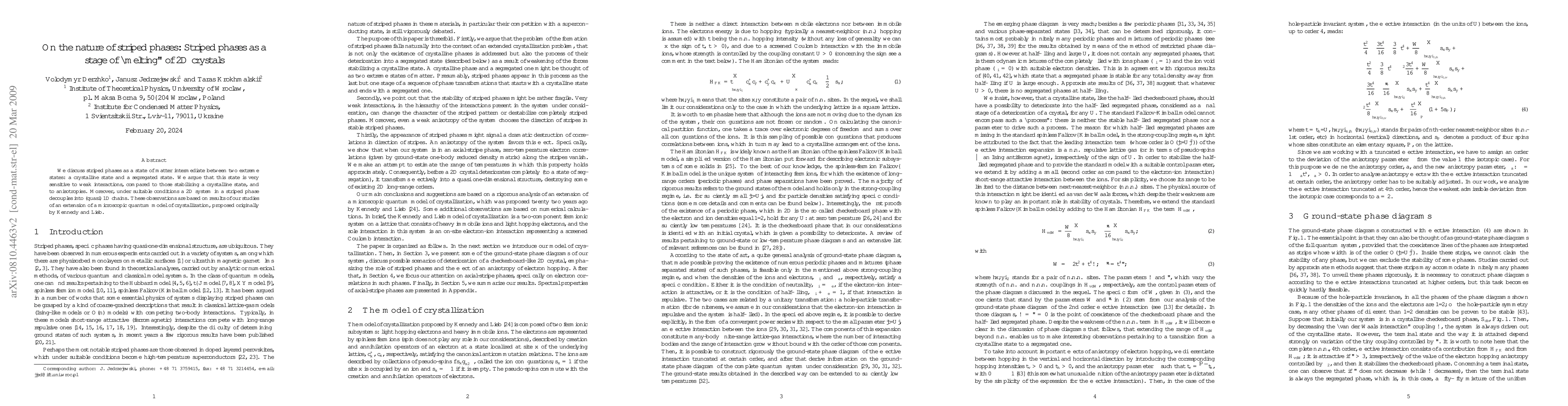 Summary: This paper explores striped phases as an intermediate state between crystalline and segregated states, emphasizing their sensitivity to weak interactions and anisotropies. It also discusses how these phases can decouple into quasi-1D chains under specific conditions, based on an extended quantum model of crystallization.