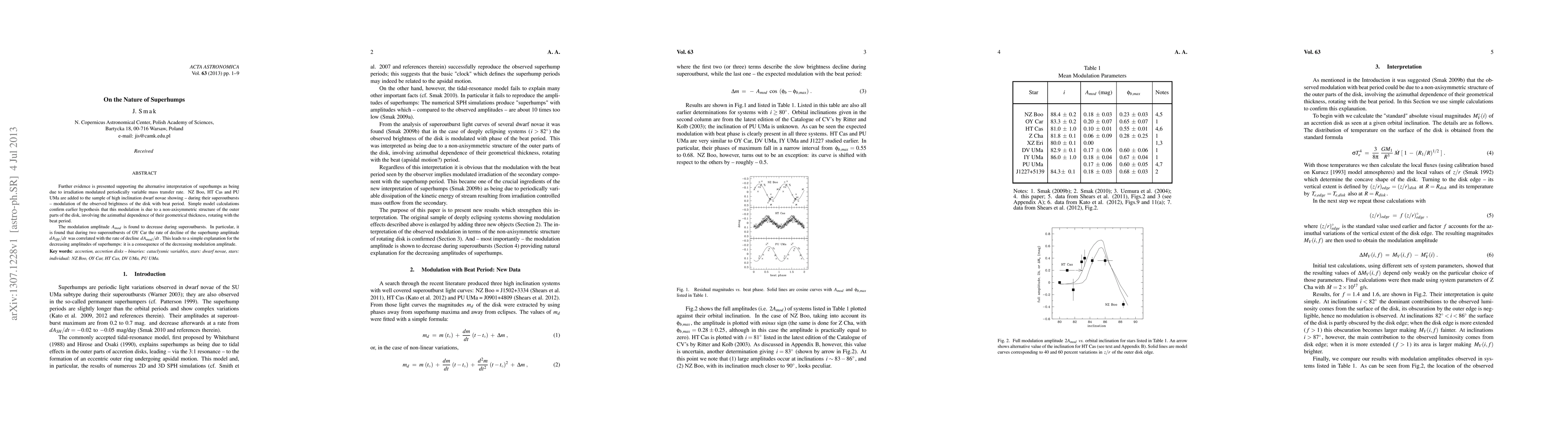The paper presents detailed analysis of superhump modulation in high inclination dwarf novae and supports the hypothesis that superhumps are caused by irradiation modulated by a periodically variable mass transfer rate, using simple model calculations.
