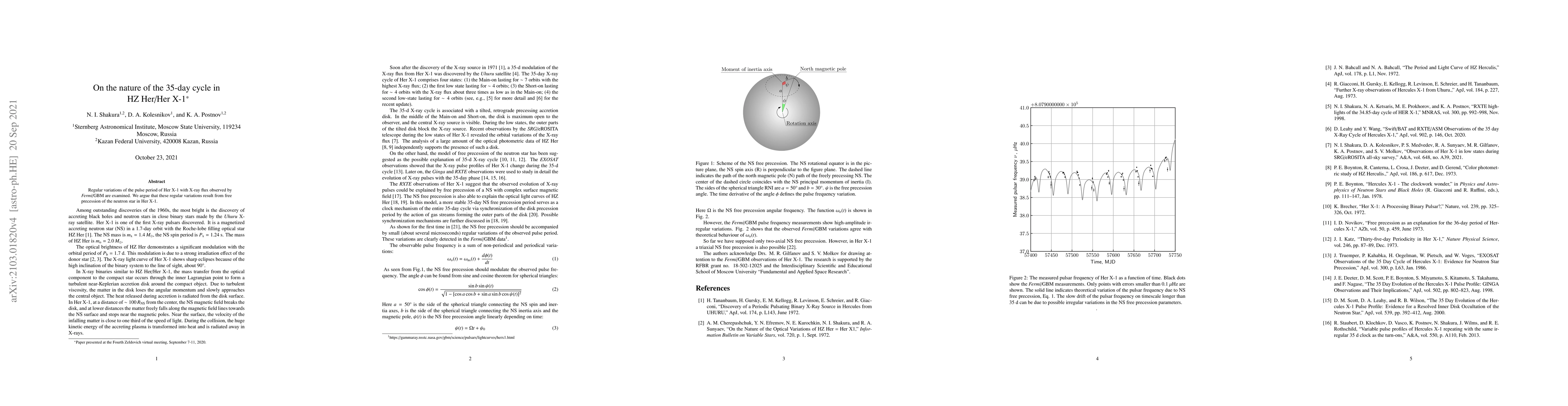 Summary: This study investigates the 35-day cycle in the pulse period of Her X-1, attributing the observed regular variations to the free precession of the neutron star, as detected by the Fermi-GBM. The findings suggest a precession-driven mechanism underlying the periodic changes in X-ray flux.