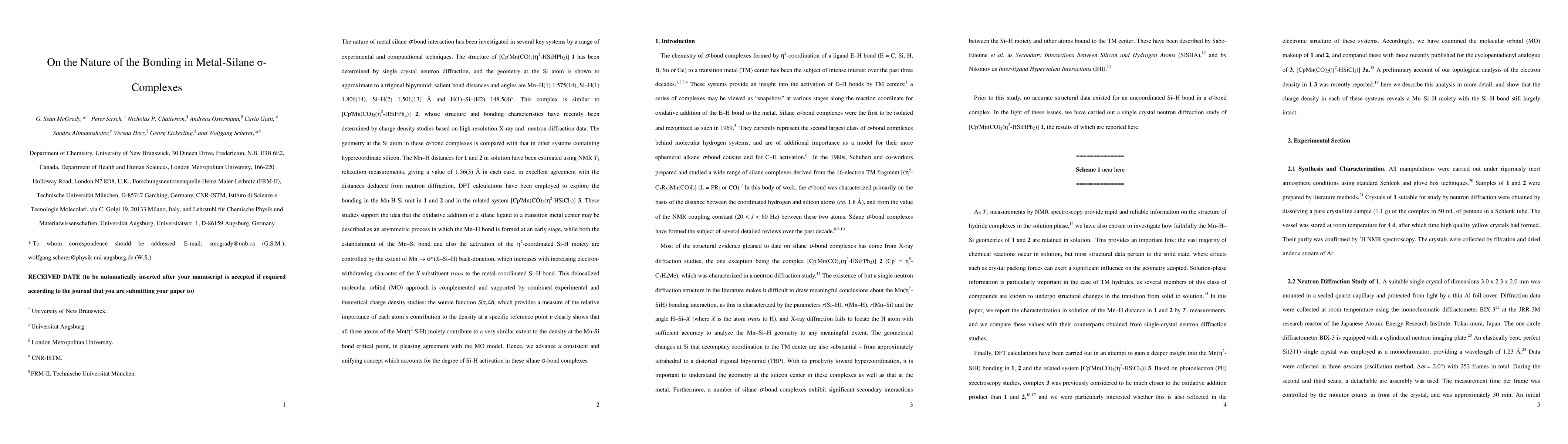 The nature of metal silane sigma-bond interaction has been investigated in several key systems by a range of experimental and computational techniques. The structure of [Cp'Mn(CO)2(eta2-HSiHPh2)] 1 has been determined by single crystal neutron diffraction, and the geometry at the Si atom is shown to approximate to a trigonal bipyramid. This complex is similar to [Cp'Mn(CO)2(eta2-HSiFPh2)] 2, whose structure and bonding characteristics have recently been determined by charge density studies based on high-resolution X-ray and neutron diffraction data. The geometry at the Si atom in these sigma-bond complexes is compared with that in other systems containing hypercoordinate silicon. The Mn-H distances for 1 and 2 in solution have been estimated using NMR T1 relaxation measurements, giving a value of 1.56(3) AA in each case, in excellent agreement with the distances deduced from neutron diffraction. DFT calculations have been employed to explore the bonding in the Mn-H-Si unit in 1 and 2 and in the related system [Cp'Mn(CO)2(eta2-HSiCl3)] 3. These studies support the idea that the oxidative addition of a silane ligand to a transition metal center may be described as an asymmetric process in which the Mn-H bond is formed at an early stage, while both the establishment of the Mn-Si bond and also the activation of the eta2-coordinated Si-H moiety are controlled by the extent of Mn-> sigma*(X-Si-H) back-donation, which increases with increasing electronwithdrawing character of the X substituent trans to the metal-coordinated Si-H bond. This delocalized molecular orbital (MO) approach is complemented and supported by combined experimental and theoretical charge density studies including the source function S(r,Omega).