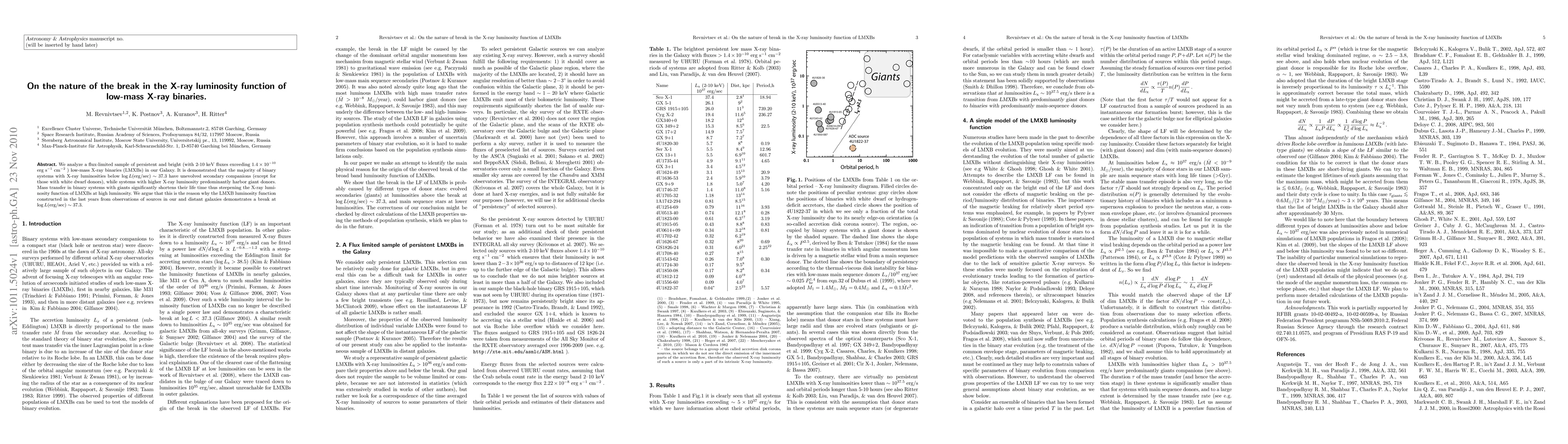This paper investigates the X-ray luminosity function of low-mass X-ray binaries (LMXBs), finding that systems with lower luminosities (<logL(erg/sec)~37.3) typically have unevolved secondary companions, while higher luminosity systems predominantly feature giant donors. The mass transfer in these giant-donor systems shortens their lifetimes, leading to a break in the LMXB luminosity function at high luminosity.