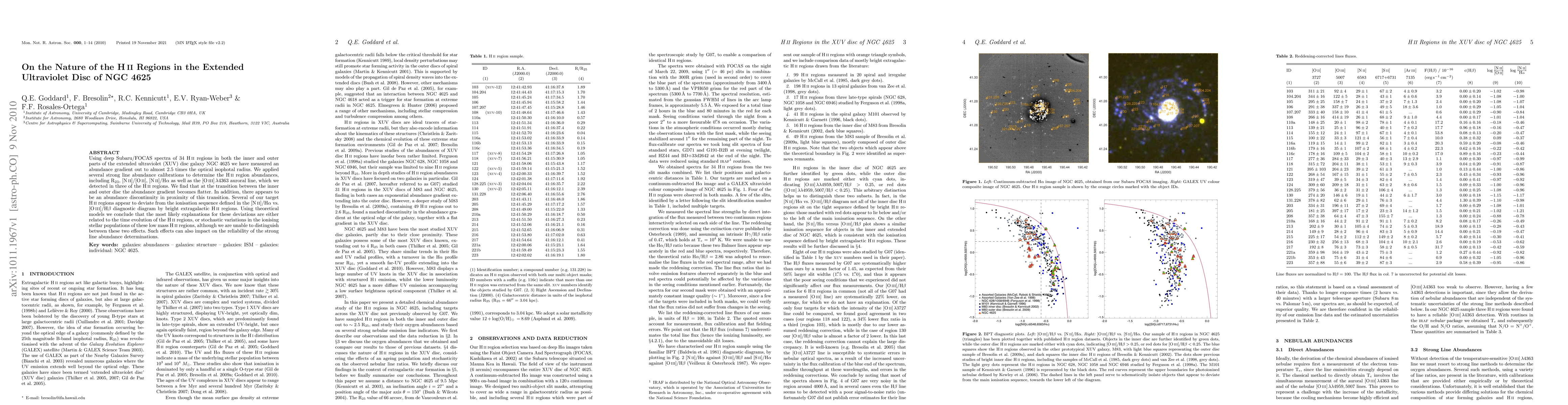 Using deep Subaru/FOCAS spectra of 34 HII regions in both the inner and outer parts of the extended ultraviolet (XUV) disc galaxy NGC 4625 we have measured an abundance gradient out to almost 2.5 times the optical isophotal radius. We applied several strong line abundance calibrations to determine the HII region abundances, including R23, [NII]/[OII], [NII]/Ha as well as the [OIII]4363 auroral line, which we detected in three of the HII regions. We find that at the transition between the inner and outer disc the abundance gradient becomes flatter. In addition, there appears to be an abundance discontinuity in proximity of this transition. Several of our target HII regions appear to deviate from the ionisation sequence defined in the [NII]/Ha vs. [OIII]/Hb diagnostic diagram by bright extragalactic HII regions. Using theoretical models we conclude that the most likely explanations for these deviations are either related to the time evolution of the HII regions, or stochastic variations in the ionising stellar populations of these low mass HII regions, although we are unable to distinguish between these two effects. Such effects can also impact on the reliability of the strong line abundance determinations.