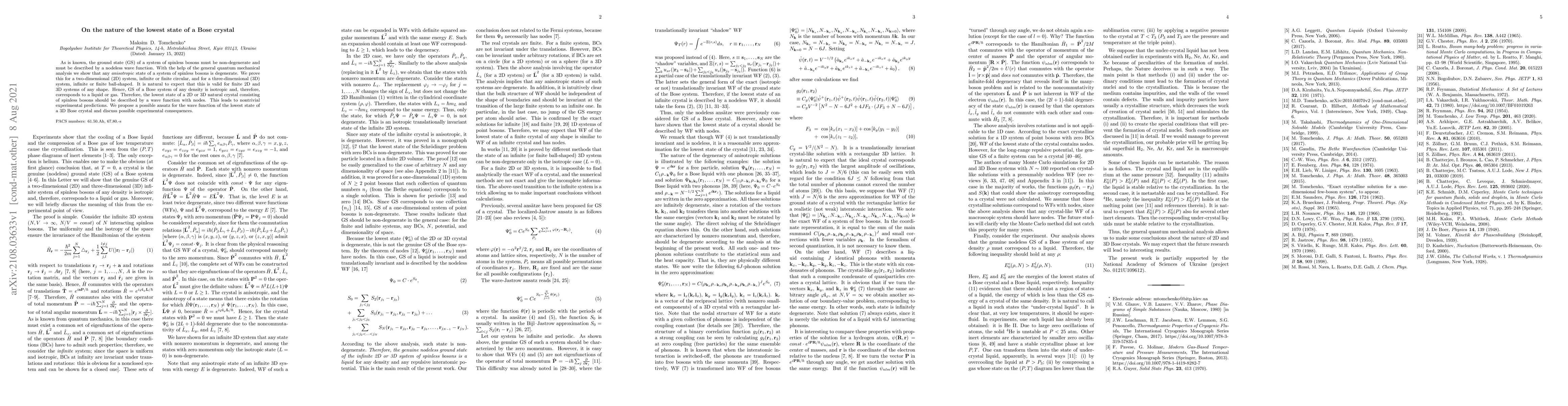 As is known, the ground state (GS) of a system of spinless bosons must be non-degenerate and must be described by a nodeless wave function. With the help of the general quantum mechanical analysis we show that any \textit{anisotropic} state of a system of spinless bosons is degenerate. We prove this for a two-dimensional (2D) system, infinite or finite circular, and for a three-dimensional (3D) system, infinite or finite ball-shaped. It is natural to expect that this is valid for finite 2D and 3D systems of any shape. Hence, GS of a Bose system of any density is isotropic and, therefore, corresponds to a liquid or gas. Therefore, the lowest state of a 2D or 3D natural crystal consisting of spinless bosons should be described by a wave function with nodes. This leads to nontrivial experimental predictions. We propose a possible ansatz for the wave function of the lowest state of a 3D Bose crystal and discuss possible experimental consequences.