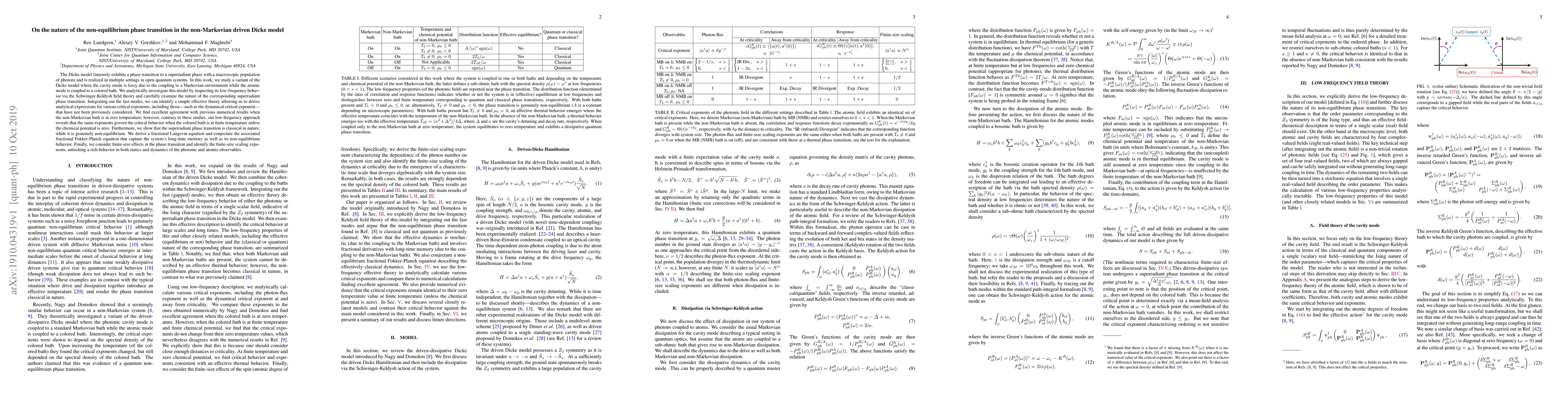 The Dicke model famously exhibits a phase transition to a superradiant phase with a macroscopic population of photons and is realized in multiple settings in open quantum systems. In this work, we study a variant of the Dicke model where the cavity mode is lossy due to the coupling to a Markovian environment while the atomic mode is coupled to a colored bath. We analytically investigate this model by inspecting its low-frequency behavior via the Schwinger-Keldysh field theory and carefully examine the nature of the corresponding superradiant phase transition. Integrating out the fast modes, we can identify a simple effective theory allowing us to derive analytical expressions for various critical exponents, including those, such as the dynamical critical exponent, that have not been previously considered. We find excellent agreement with previous numerical results when the non-Markovian bath is at zero temperature; however, contrary to these studies, our low-frequency approach reveals that the same exponents govern the critical behavior when the colored bath is at finite temperature unless the chemical potential is zero. Furthermore, we show that the superradiant phase transition is classical in nature, while it is genuinely non-equilibrium. We derive a fractional Langevin equation and conjecture the associated fractional Fokker-Planck equation that capture the system's long-time memory as well as its non-equilibrium behavior. Finally, we consider finite-size effects at the phase transition and identify the finite-size scaling exponents, unlocking a rich behavior in both statics and dynamics of the photonic and atomic observables.