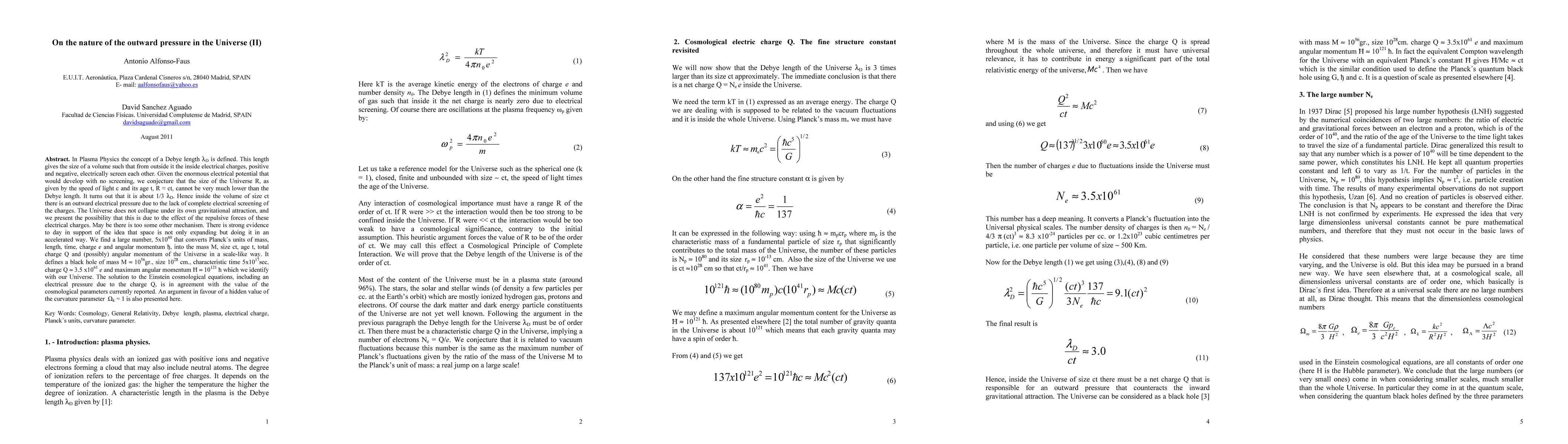 In Plasma Physics the concept of the Debye length \lambdaD is defined. This length gives the size of a volume such that from outside it the inside electrical charges, positive and negative, electrically screen each other. Given the enormous electrical potential that would develop with no screening, we conjecture that the size of the Universe R, as given by the speed of light c and its age t, R \approx ct, cannot be very much lower than the Debye length. It turns out that it is about 1/3 \lambdaD. Hence inside the volume of size ct there is an otward electrical pressure due to the lack of complete electrical screening of the charges. The Universe does not collapse under its own gravitational attraction, and we present the possibility that this is due to the effect of the repulsive forces of these electrical charges. May be there is too some other mechanism. There is strong evidence today in support of the idea that space is not only expanding but doing it in an accelerated way. We find a large number, 5x1060 that converts Planck's unit of mass, length, time, charge e and angular momentum \hbar, into the mass M, size ct, age t, total charge Q and (possibly) angular momentum of the Universe in a scale like way. It defines a black hole of mass M \approx 1056gr., size 1028 cm., characteristic time 5x1017sec, charge Q \approx 3.5 x1061e and maximum angular momentum \Hbar \approx 10121 \hbar which we identify with our Universe. The solution to the Einstein cosmological equations, including an electrical pressure due to the charge Q, is in agreement with the value of the cosmological parameters currently reported. An argument in favour of a hidden value of the curvature parameter {\Omega}k \approx 1 is also presented here.