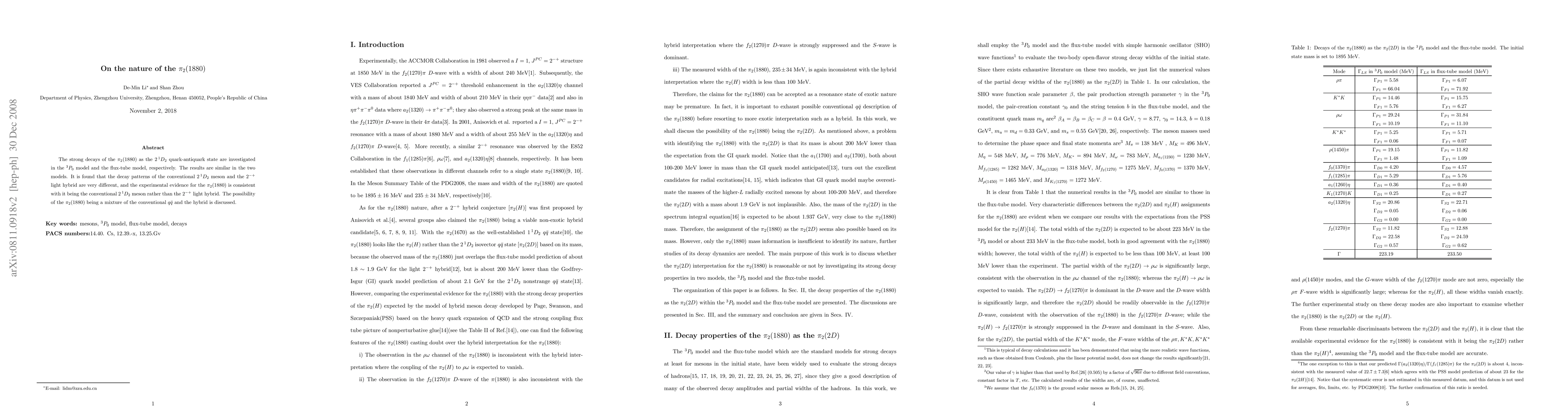 This paper investigates the strong decay patterns of the $\pi_2(1880)$ using both the $^3P_0$ and flux-tube models, finding it behaves like a conventional $2 ^1D_2$ meson rather than a $2^{-+}$ light hybrid, though a mixture of both states is considered.