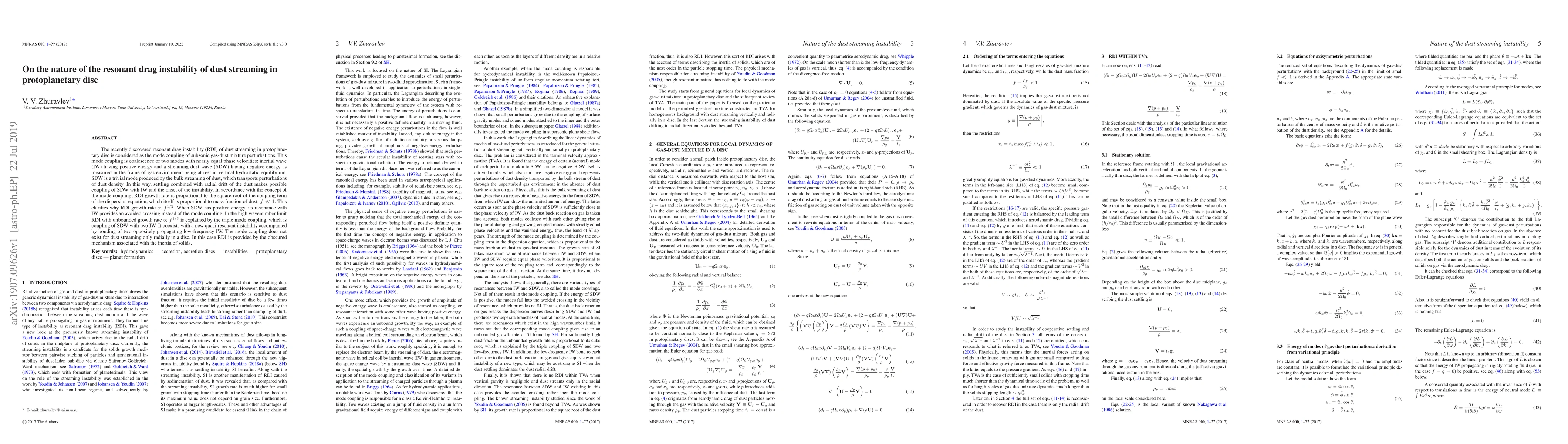 This paper investigates the resonant drag instability (RDI) in protoplanetary discs, where dust streaming induces mode coupling between inertial waves and streaming dust waves. The instability grows proportionally to the square root of the dust mass fraction, explaining its dependence on dust density. In high wavenumber regimes, triple mode coupling leads to an instability with a growth rate proportional to the cube root of the dust fraction.