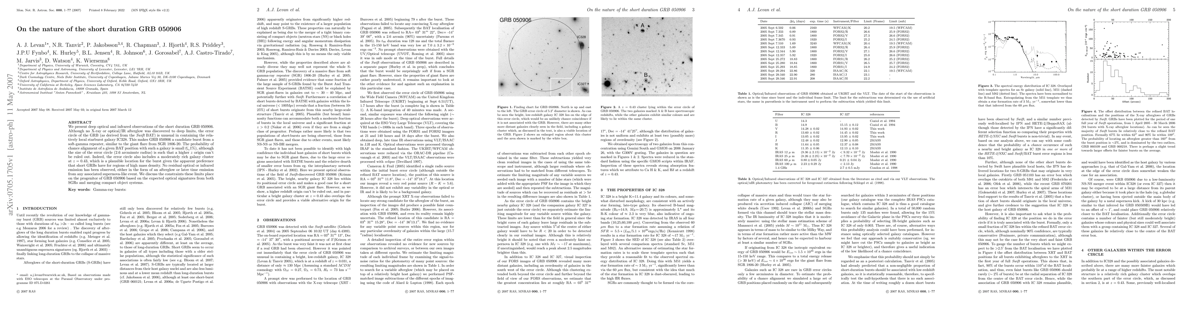 We present deep optical and infrared observations of the short duration GRB 050906. Although no X-ray or optical/IR afterglow was discovered to deep limits, the error circle of the GRB (as derived from the Swift BAT) is unusual incontaining the relatively local starburst galaxy IC328. This makes GRB 050906 a candidate burst from a soft-gamma repeater, similar to the giant flare from SGR 1806-20. The probability of chance alignment of a given BAT position with such a galaxy is small (<1%), although the size of the error circle (2.6 arcminute radius) is such that a higher-z origin can't be ruled out. Indeed, the error circle also includes a moderately rich galaxy cluster at z=0.43, which is a plausible location for the burst given the apparent preference that short GRBs have for regions of high mass density. No residual optical or infrared emission has been observed, either in the form of an afterglow or later time emission from any associated supernova-like event. We discuss the constraints these limits place on the progenitor of GRB 050906 based on the expected optical signatures from both SGRs and merging compact object systems.