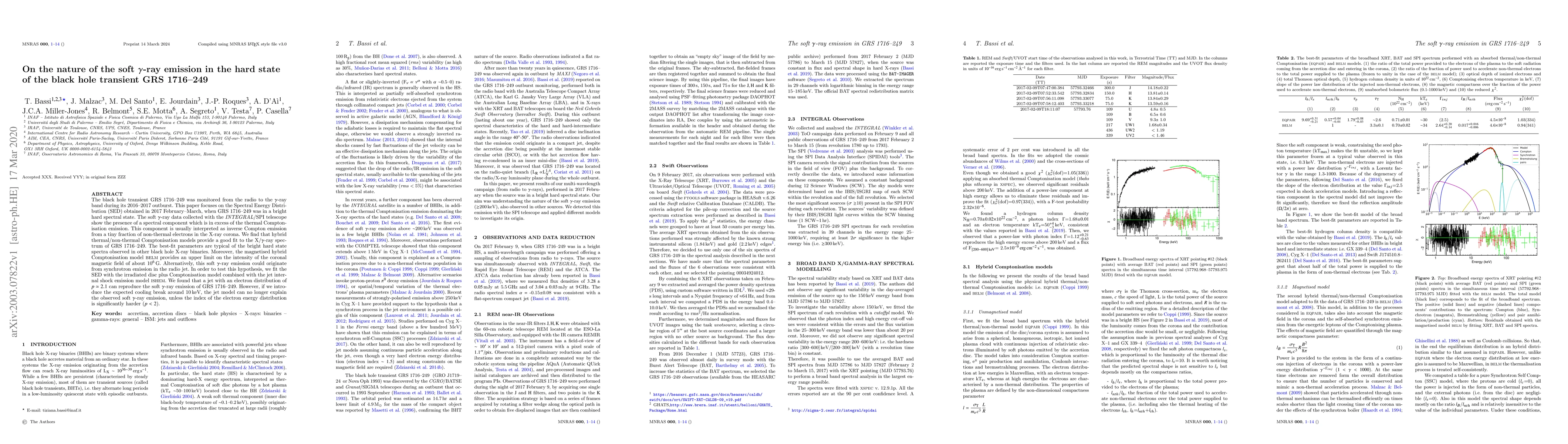 The black hole transient GRS 1716-249 was monitored from the radio to the gamma-ray band during its 2016-2017 outburst. This paper focuses on the Spectral Energy Distribution (SED) obtained in 2017 February-March, when GRS 1716-249 was in a bright hard spectral state. The soft gamma-ray data collected with the INTEGRAL/SPI telescope show the presence of a spectral component which is in excess of the thermal Comptonisation emission. This component is usually interpreted as inverse Compton emission from a tiny fraction of non-thermal electrons in the X-ray corona. We find that hybrid thermal/non-thermal Comptonisation models provide a good fit to the X/gamma-ray spectrum of GRS 1716-249. The best-fit parameters are typical of the bright hard state spectra observed in other black hole X-ray binaries. Moreover, the magnetised hybrid Comptonisation model BELM provides an upper limit on the intensity of the coronal magnetic field of about 1E+06 G. Alternatively, this soft gamma-ray emission could originate from synchrotron emission in the radio jet. In order to test this hypothesis, we fit the SED with the irradiated disc plus Comptonisation model combined with the jet internal shock emission model ISHEM. We found that a jet with an electron distribution of p~2.1 can reproduce the soft gamma-ray emission of GRS 1716-249. However, if we introduce the expected cooling break around 10 keV, the jet model can no longer explain the observed soft gamma-ray emission, unless the index of the electron energy distribution is significantly harder (p<2).