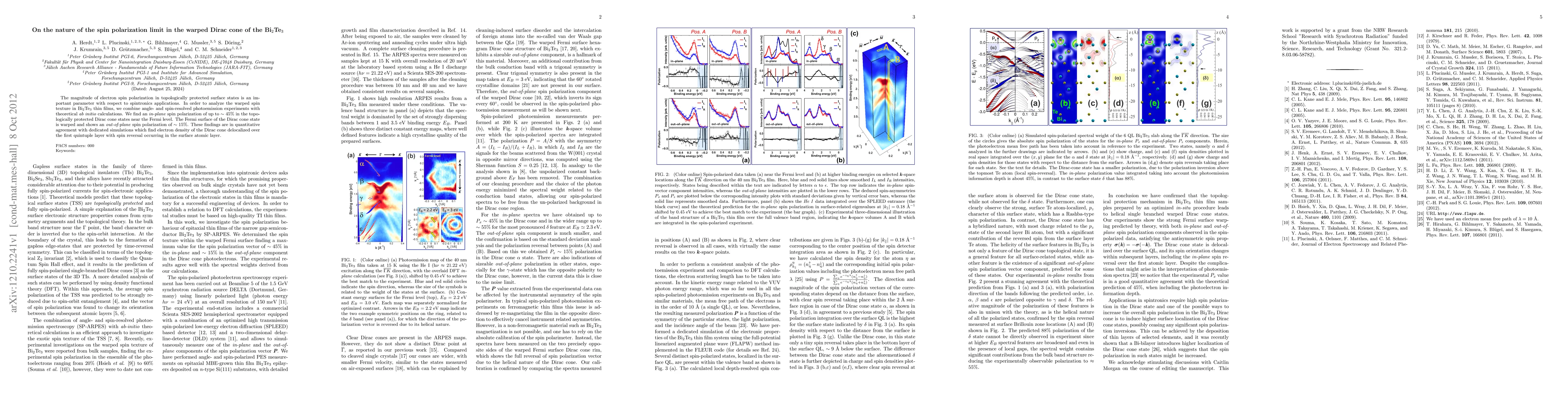 The magnitude of electron spin polarization in topologically protected surface states is an important parameter with respect to spintronics applications. In order to analyze the warped spin texture in Bi$_2$Te$_3$ thin films, we combine angle- and spin-resolved photoemission experiments with theoretical \textit{ab initio} calculations. We find an \textit{in-plane} spin polarization of up to $\sim$~45\% in the topologically protected Dirac cone states near the Fermi level. The Fermi surface of the Dirac cone state is warped and shows an \textit{out-of-plane} spin polarization of $\sim$~15\%. These findings are in quantitative agreement with dedicated simulations which find electron density of the Dirac cone delocalized over the first quintuple layer with spin reversal occurring in the surface atomic layer.