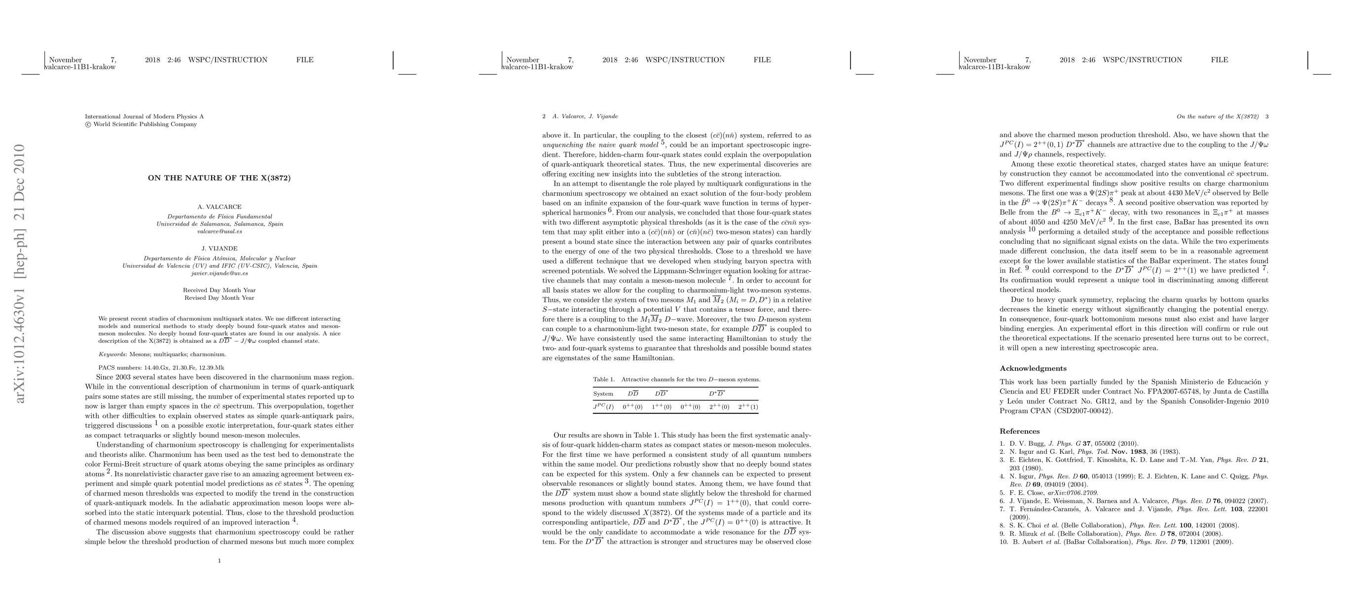 We present recent studies of charmonium multiquark states. We use different interacting models and numerical methods to study deeply bound four-quark states and meson-meson molecules. No deeply bound four-quark states are found in our analysis. A nice description of the X(3872) is obtained as a $D\bar{D}^*-J/\Psi\omega$ coupled channel state.