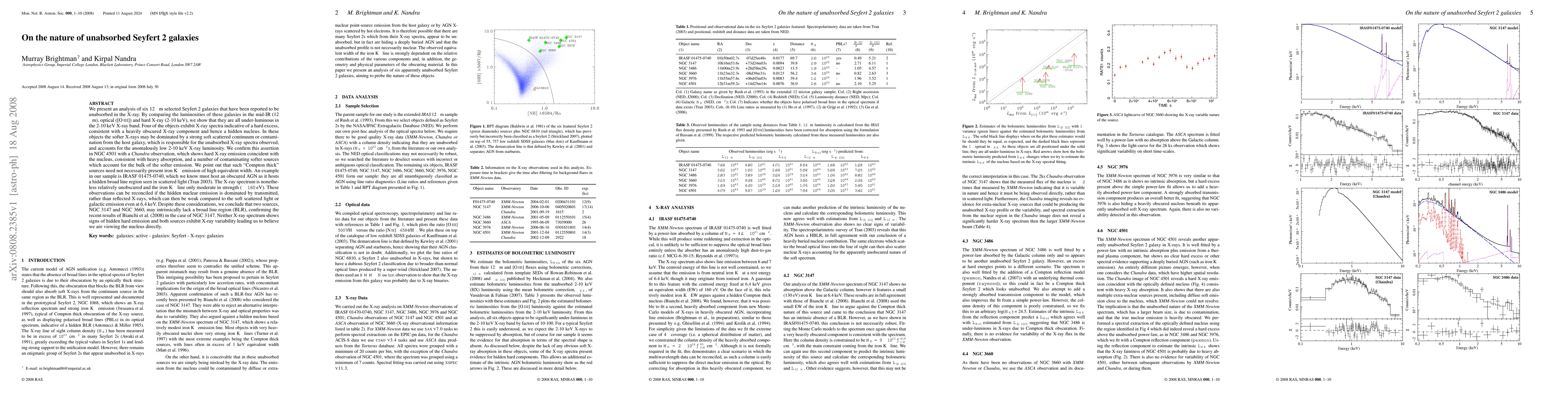 We present an analysis of six 12 um selected Seyfert 2 galaxies that have been reported to be unabsorbed in the X-ray. By comparing the luminosities of these galaxies in the mid-IR (12um), optical ([O III]) and hard X-ray (2-10 keV), we show that they are all under-luminous in the 2-10 keV X-ray band. Four of the objects exhibit X-ray spectra indicative of a hard excess, consistent with a heavily obscured X-ray component and hence a hidden nucleus. In these objects the softer X-rays may be dominated by a strong soft scattered continuum or contamination from the host galaxy, which is responsible for the unabsorbed X-ray spectra observed, and accounts for the anomalously low 2-10 keV X-ray luminosity. We confirm this assertion in NGC4501 with a Chandra observation, which shows hard X-ray emission coincident with the nucleus, consistent with heavy absorption, and a number of contaminating softer sources which account for the bulk of the softer emission. We point out that such 'Compton thick' sources need not necessarily present iron Ka emission of high EW. An example in our sample is IRASF01475-0740, which we know must host an obscured AGN as it hosts a HBLR seen in scattered light (Tran 2003). The X-ray spectrum is nonetheless relatively unobscured and the iron Ka line only moderate in strength. These observations can be reconciled if the hidden nuclear emission is dominated by transmitted, rather than reflected X-rays, which can then be weak compared to the soft scattered light or galactic emission. Despite these considerations, we conclude that NGC3147 & 3660 may intrinsically lack a BLR, confirming the recent results of Bianchi et al. (2008) for NGC3147. Neither X-ray spectrum shows signs of hidden hard emission and both sources exhibit X-ray variability leading us to believe we are viewing the nucleus directly.