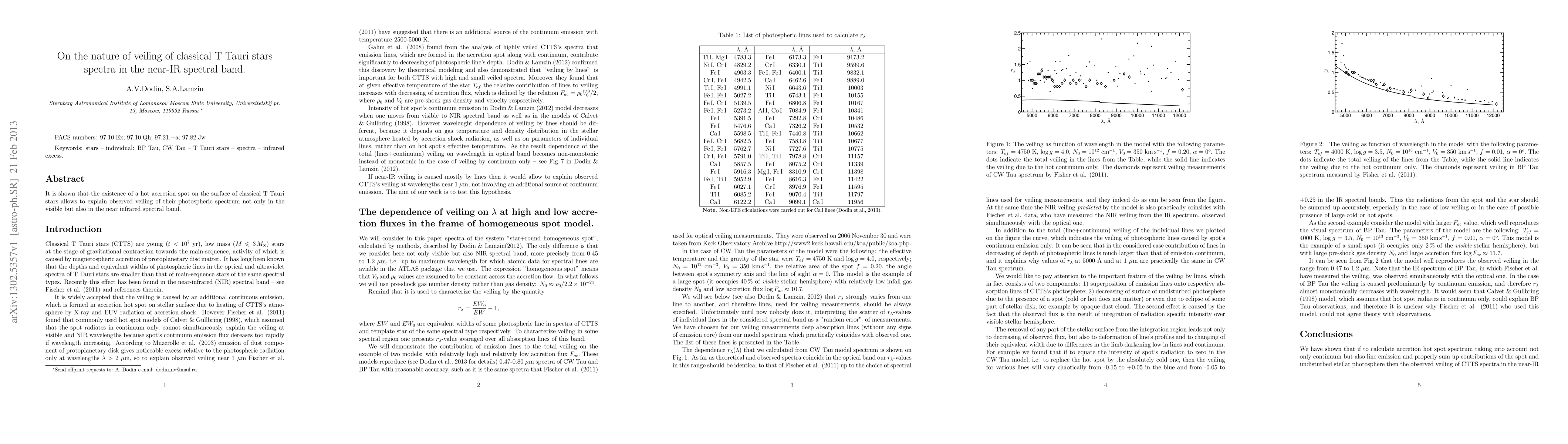 Veiling of classical T Tauri stars' spectra in near-IR is explained by hot accretion spots on their surfaces, impacting visible light as well.