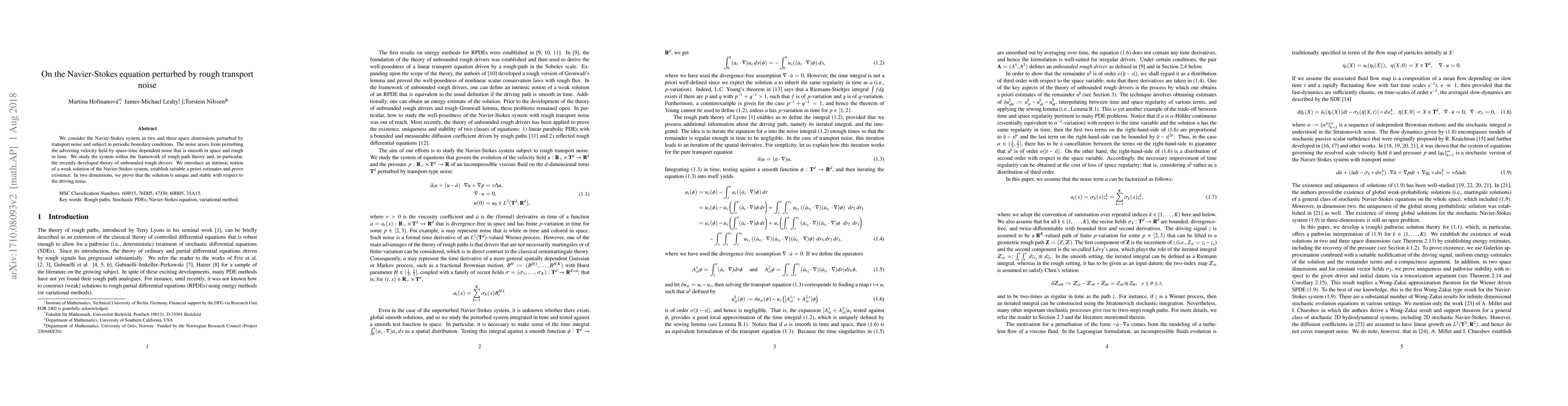 This paper investigates the Navier-Stokes equation perturbed by rough transport noise using rough path theory, establishing a weak solution concept and proving existence, uniqueness, and stability in two dimensions. The noise is smooth in space but rough in time, affecting the advecting velocity field.