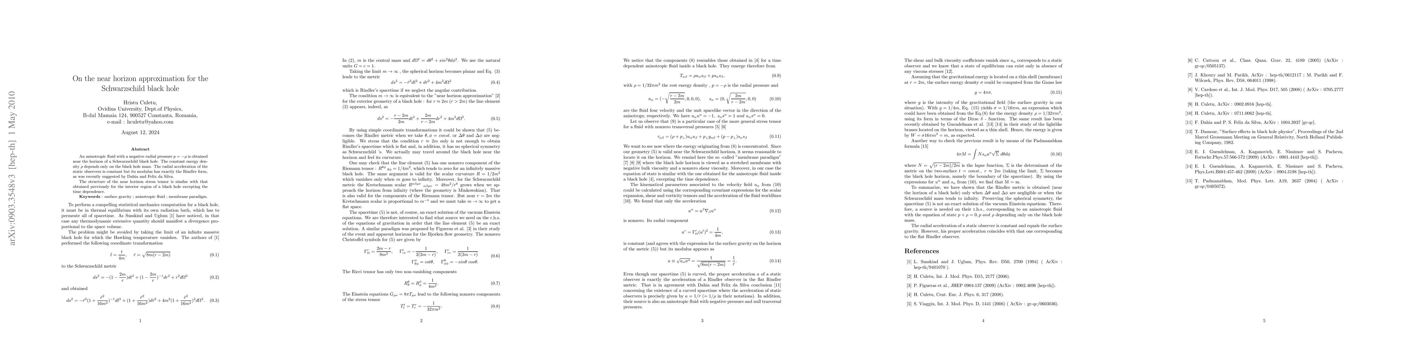 An anisotropic fluid with a negative radial pressure $p = - \rho$ is supposed to exist near the horizon of a Schwarzschild black hole. The constant energy density $\rho$ depends only on the black hole mass. The radial acceleration of the static observers is constant but its modulus has exactly the Rindler form, as was recently suggested by Dahia and Felix da Silva. The structure of the stress tensor is similar with that obtained previously for the interior region of a black hole, excepting the time dependence.