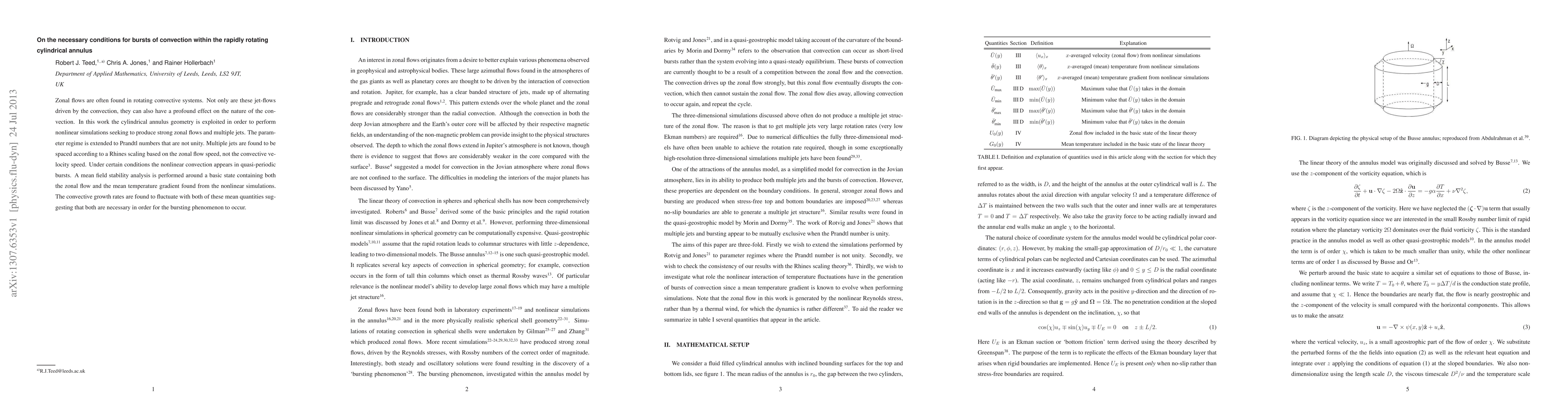 This paper investigates the conditions for bursts of convection in a rapidly rotating cylindrical annulus, finding that multiple jets are spaced based on Rhines scaling. Nonlinear simulations reveal that quasi-periodic bursts of convection require both zonal flow and mean temperature gradient, as indicated by fluctuating convective growth rates.
