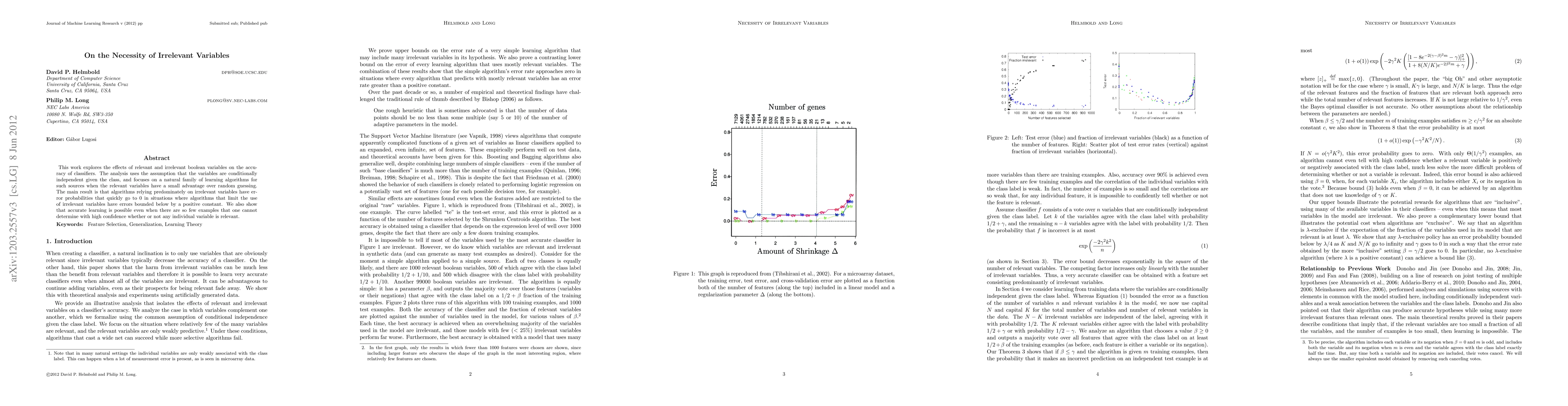 This work explores the effects of relevant and irrelevant boolean variables on the accuracy of classifiers. The analysis uses the assumption that the variables are conditionally independent given the class, and focuses on a natural family of learning algorithms for such sources when the relevant variables have a small advantage over random guessing. The main result is that algorithms relying predominately on irrelevant variables have error probabilities that quickly go to 0 in situations where algorithms that limit the use of irrelevant variables have errors bounded below by a positive constant. We also show that accurate learning is possible even when there are so few examples that one cannot determine with high confidence whether or not any individual variable is relevant.