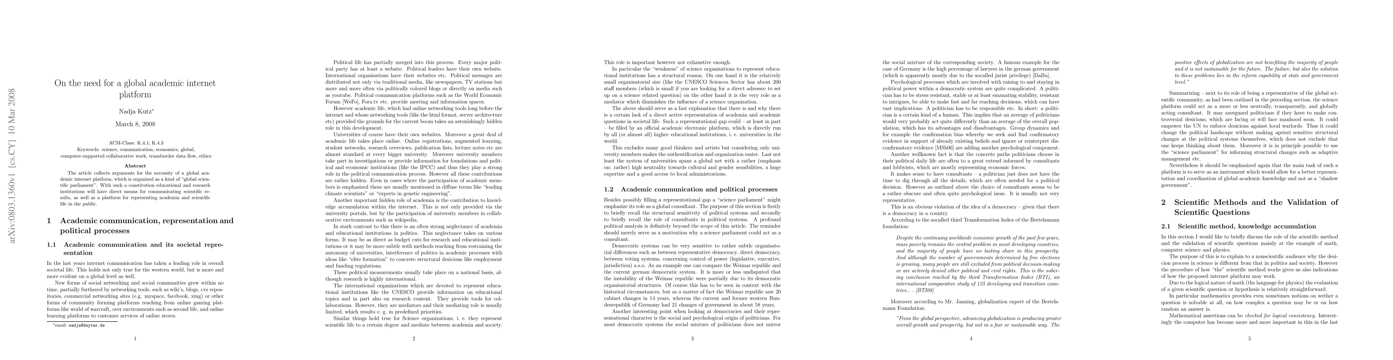 The article collects arguments for the necessity of a global academic internet platform, which is organized as a kind of ``global scientific parliament''. With such a constitution educational and research institutions will have direct means for communicating scientific results, as well as a platform for representing academia and scientific life in the public.