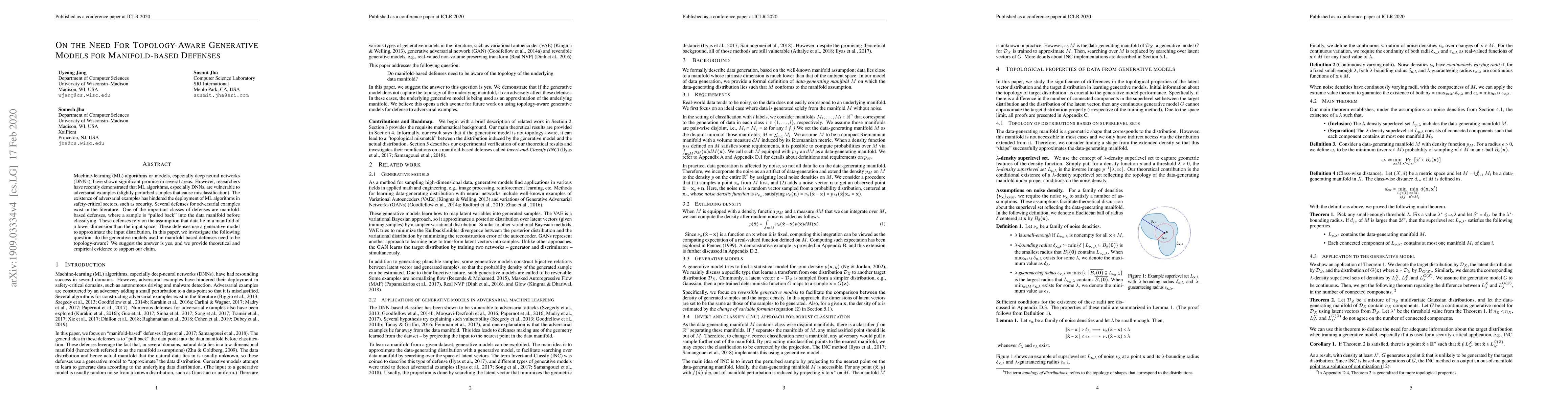 This paper explores the necessity of topology-aware generative models in manifold-based defenses against adversarial examples. It argues that traditional generative models may fail to adequately approximate the data manifold, suggesting that topology-aware models are essential for effective defense.
