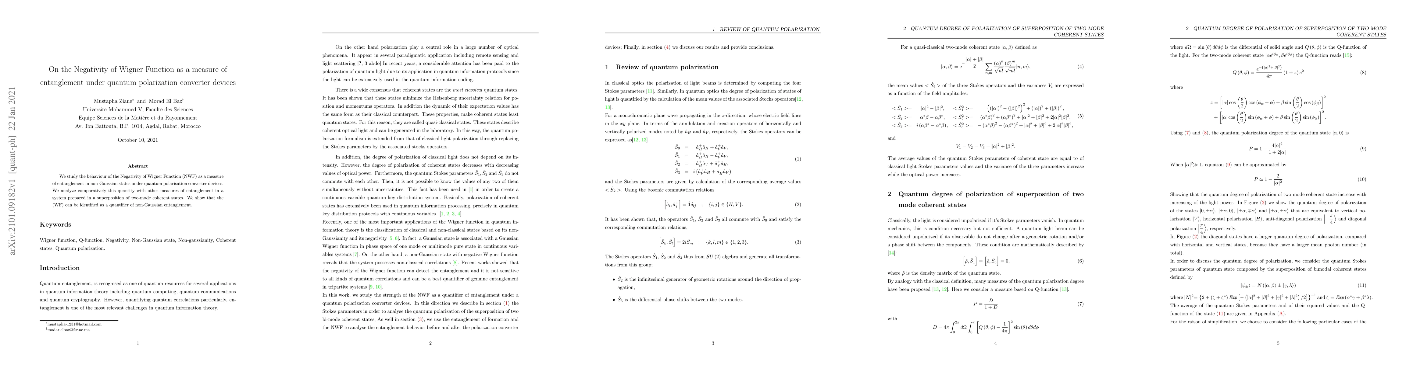 We study the behaviour of the Negativity of Wigner Function (NWF) as a measure of entanglement in non-Gaussian states under quantum polarisation converter devices. We analyze comparatively this quantity with other measures of entanglement in a system prepared in a superposition of two-mode coherent states. We show that the (WF) can be identified as a quantifier of non-Gaussian entanglement.
