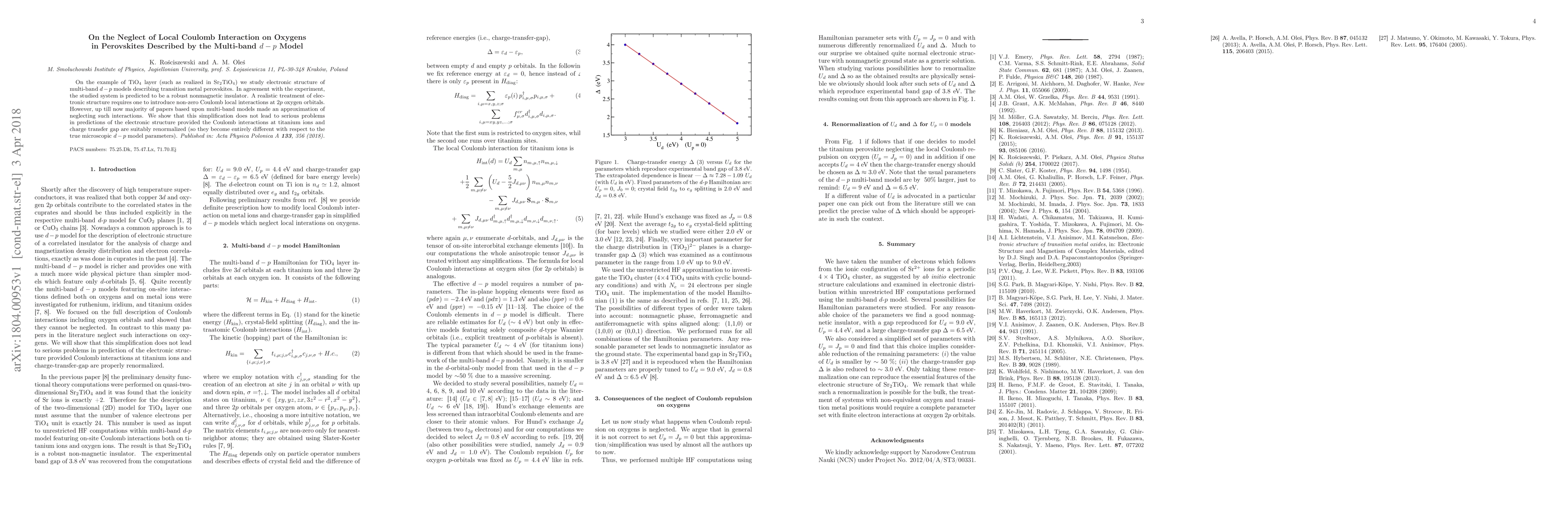 On the example of TiO$_4$ layer (such as realized in Sr$_2$TiO$_4$) we study electronic structure of multi-band $d-p$ models describing transition metal perovskites. In agreement with the experiment, the studied system is predicted to be a robust nonmagnetic insulator. A realistic treatment of electronic structure requires one to introduce non-zero Coulomb local interactions at $2p$ oxygen orbitals. However, up till now majority of papers based upon multi-band models made an approximation of neglecting such interactions. We show that this simplification does not lead to serious problems in predictions of the electronic structure provided the Coulomb interactions at titanium ions and charge transfer gap are suitably renormalized (so they become entirely different with respect to the true microscopic $d-p$ model parameters).