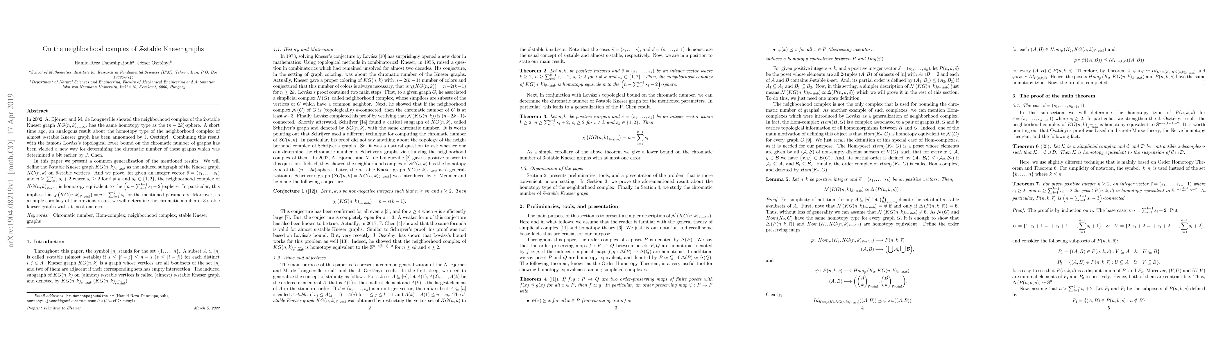 In 2002, A. Bj\"orner and M. de Longueville showed the neighborhood complex of the $2$-stable Kneser graph ${KG(n, k)}_{2-\textit{stab}}$ has the same homotopy type as the $(n-2k)$-sphere. A short time ago, an analogous result about the homotopy type of the neighborhood complex of almost $s$-stable Kneser graph has been announced by J. Oszt\'{e}nyi. Combining this result with the famous Lov\'{a}sz's topological lower bound on the chromatic number of graphs has been yielded a new way for determining the chromatic number of these graphs which was determined a bit earlier by P. Chen. In this paper we present a common generalization of the mentioned results. We will define the $\vec{s}$-stable Kneser graph ${KG(n, k)}_{\vec{s}-\textit{stab}}$ as the induced subgraph of the Kneser graph $KG(n, k)$ on $\vec{s}$-stable vertices. And we prove, for given an integer vector $\vec{s}=(s_1,\ldots, s_k)$ and $n\geq\sum_{i=1}^{k-1}s_i+2$ where $s_i\geq2$ for $i\neq k$ and $s_k\in\{1,2\}$, the neighborhood complex of ${KG(n, k)}_{\vec{s}-\textit{stab}}$ is homotopy equivalent to the $\left(n-\sum_{i=1}^{k-1}s_i-2\right)$-sphere. In particular, this implies that $\chi\left({KG(n, k)}_{\vec{s}-\textit{stab}}\right)= n-\sum_{i=1}^{k-1}s_i$ for the mentioned parameters. Moreover, as a simple corollary of the previous result, we will determine the chromatic number of 3-stable kneser graphs with at most one error.