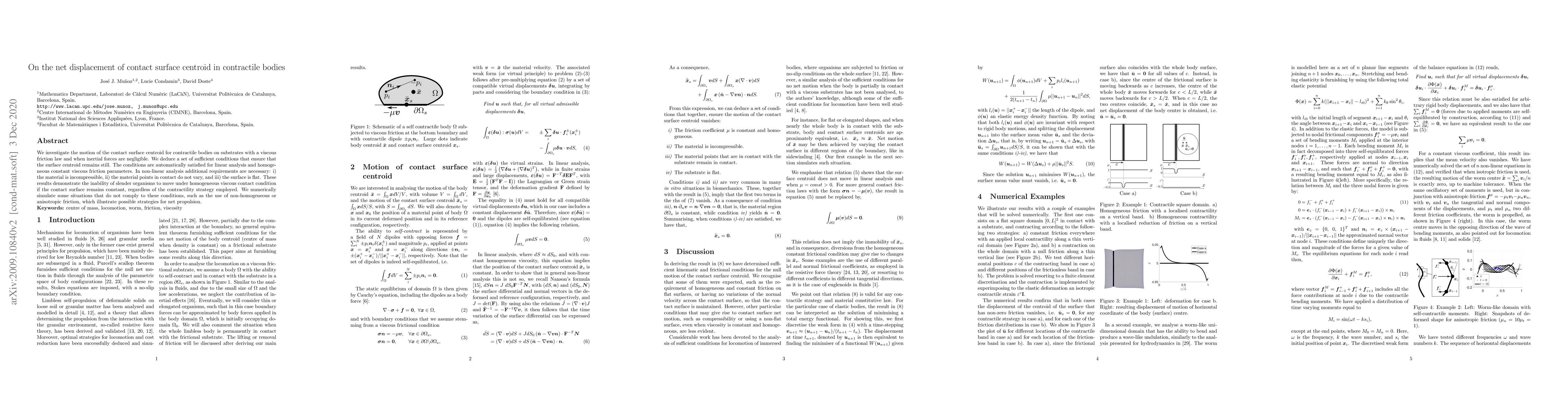 Contractile bodies on substrates with viscous friction can't move if the contact surface remains still; additional conditions allow for propulsion under non-homogeneous friction.