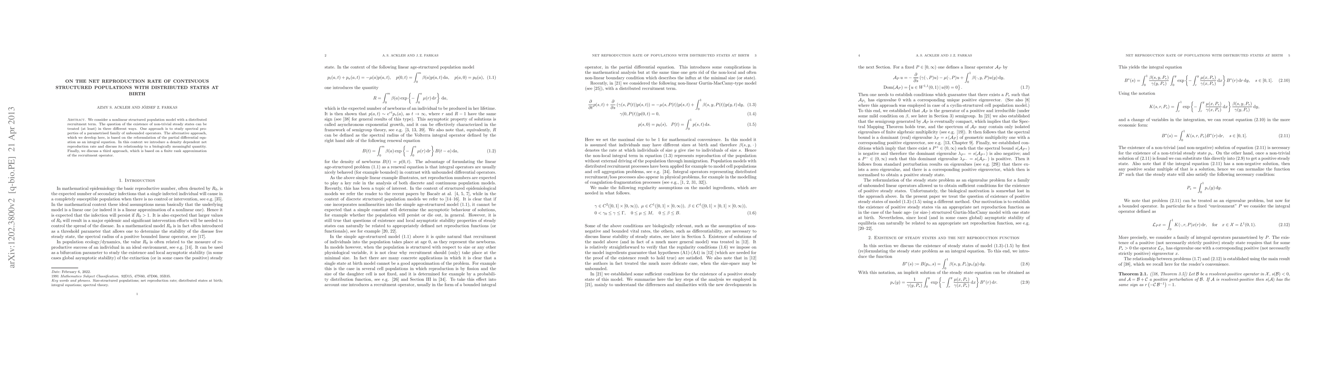 We consider a nonlinear structured population model with a distributed recruitment term. The question of the existence of non-trivial steady states can be treated (at least!) in three different ways. One approach is to study spectral properties of a parametrized family of unbounded operators. The alternative approach, on which we focus here, is based on the reformulation of the problem as an integral equation. In this context we introduce a density dependent net reproduction rate and discuss its relationship to a biologically meaningful quantity. Finally, we briefly discuss a third approach, which is based on the finite rank approximation of the recruitment operator.