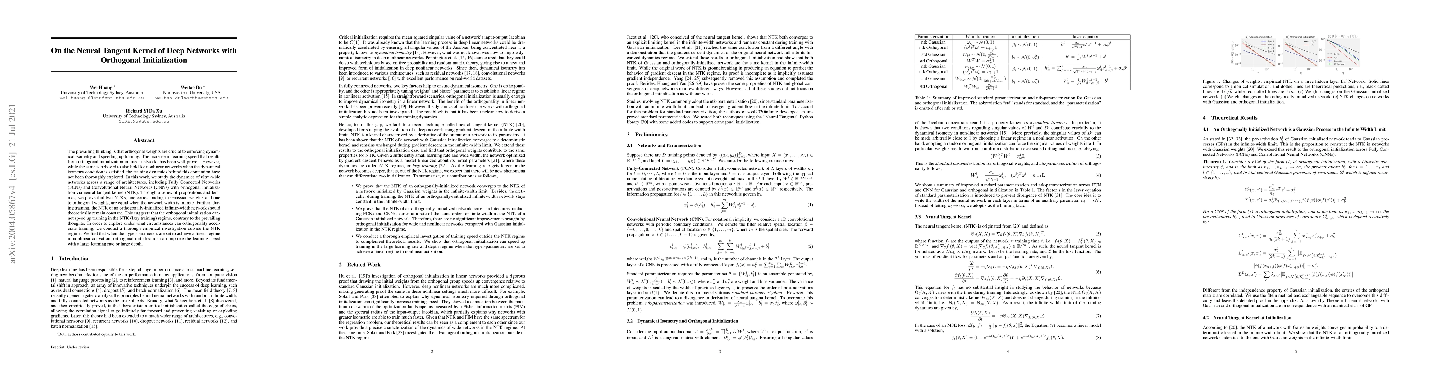 The prevailing thinking is that orthogonal weights are crucial to enforcing dynamical isometry and speeding up training. The increase in learning speed that results from orthogonal initialization in linear networks has been well-proven. However, while the same is believed to also hold for nonlinear networks when the dynamical isometry condition is satisfied, the training dynamics behind this contention have not been thoroughly explored. In this work, we study the dynamics of ultra-wide networks across a range of architectures, including Fully Connected Networks (FCNs) and Convolutional Neural Networks (CNNs) with orthogonal initialization via neural tangent kernel (NTK). Through a series of propositions and lemmas, we prove that two NTKs, one corresponding to Gaussian weights and one to orthogonal weights, are equal when the network width is infinite. Further, during training, the NTK of an orthogonally-initialized infinite-width network should theoretically remain constant. This suggests that the orthogonal initialization cannot speed up training in the NTK (lazy training) regime, contrary to the prevailing thoughts. In order to explore under what circumstances can orthogonality accelerate training, we conduct a thorough empirical investigation outside the NTK regime. We find that when the hyper-parameters are set to achieve a linear regime in nonlinear activation, orthogonal initialization can improve the learning speed with a large learning rate or large depth.