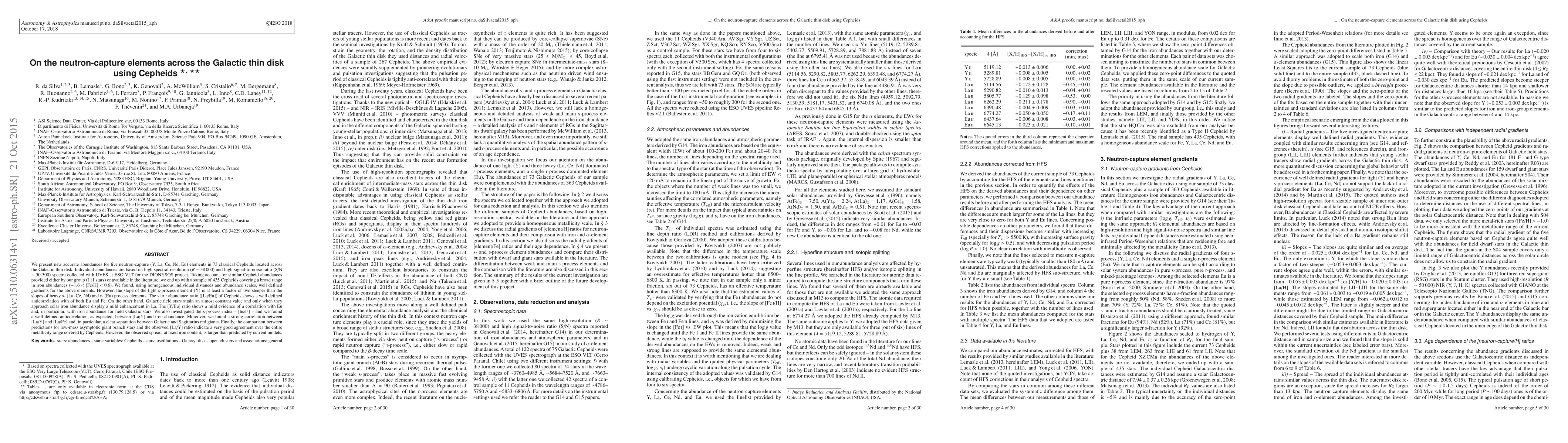 This paper reports precise abundances of neutron-capture elements in 73 Cepheids across the Galactic thin disk, revealing distinct gradients for different s-process and r-process elements. The study shows a steeper gradient for the light s-process element Y compared to heavier s- and r-process elements, and identifies significant correlations between these elements and iron abundance.