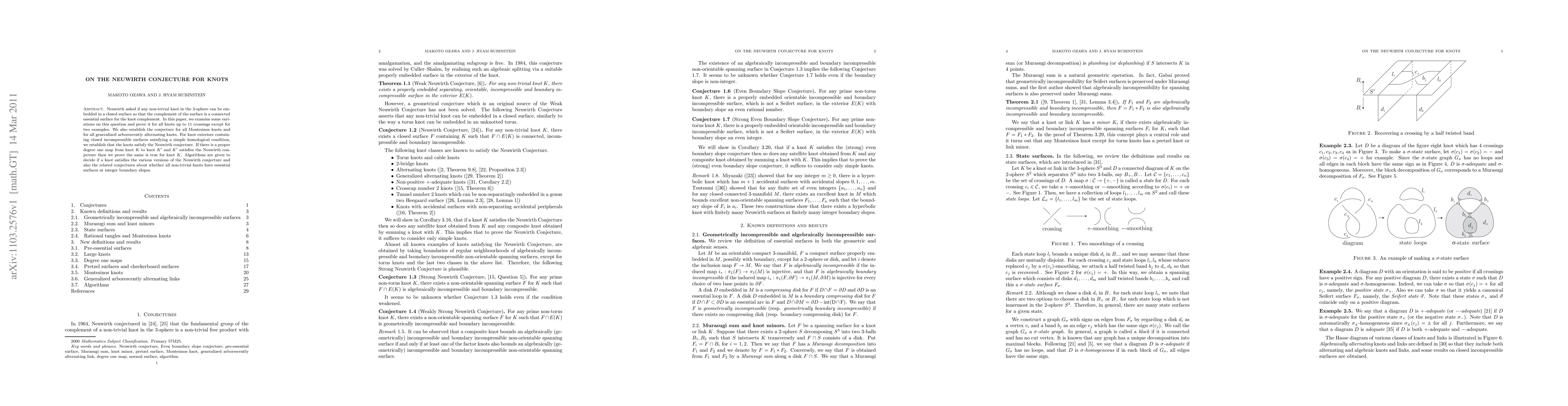 Neuwirth asked if any non-trivial knot in the 3-sphere can be embedded in a closed surface so that the complement of the surface is a connected essential surface for the knot complement. In this paper, we examine some variations on this question and prove it for all knots up to 11 crossings except for two examples. We also establish the conjecture for all Montesinos knots and for all generalized arborescently alternating knots. For knot exteriors containing closed incompressible surfaces satisfying a simple homological condition, we establish that the knots satisfy the Neuwirth conjecture. If there is a proper degree one map from knot $K$ to knot $K'$ and $K'$ satisfies the Neuwirth conjecture then we prove the same is true for knot $K$. Algorithms are given to decide if a knot satisfies the various versions of the Neuwirth conjecture and also the related conjectures about whether all non-trivial knots have essential surfaces at integer boundary slopes.
