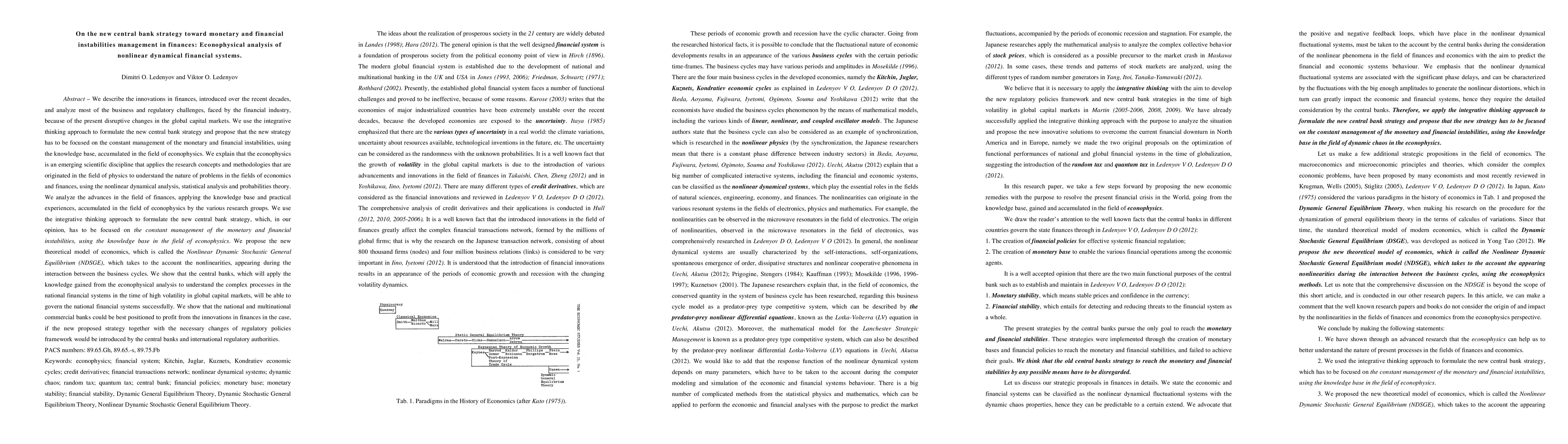 We describe the innovations in finances, introduced over the recent decades, and analyze most of the business and regulatory challenges, faced by the financial industry, because of the present disruptive changes in the global capital markets. We use the integrative thinking approach to formulate the new central bank strategy and propose that the new strategy has to be focused on the constant management of the monetary and financial instabilities, using the knowledge base in the field of econophysics. We propose the new theoretical model of economics, which is called the Nonlinear Dynamic Stochastic General Equilibrium (NDSGE), which takes to the account the nonlinearities, appearing during the interaction between the business cycles. We show that the central banks, which will apply the knowledge gained from the econophysical analysis to understand the complex processes in the national financial systems in the time of high volatility in global capital markets, will be able to govern the national financial systems successfully.