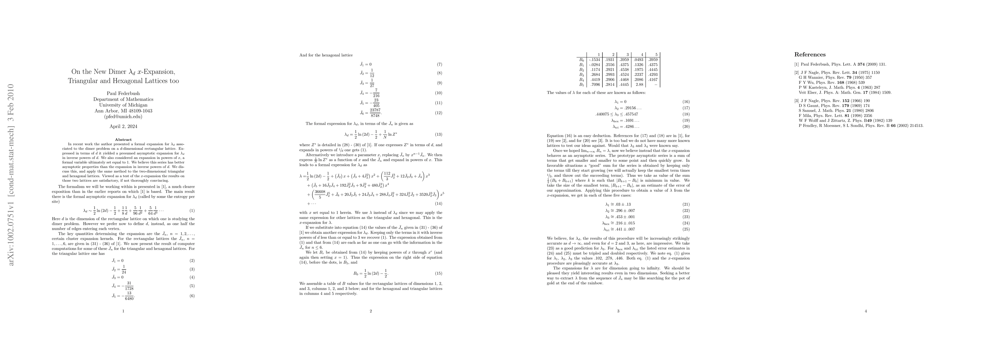 In recent work the author presented a formal expansion for lambda_d associated to the dimer problem on a d-dimensional rectangular lattice. Expressed in terms of d it yielded a presumed asymptotic expansion for lambda_d in inverse powers of d. We also considered an expansion in powers of x, a formal variable ultimately set equal to 1. We believe this series has better asymptotic properties than the expansion in inverse powers of d. We discuss this, and apply the same method to the two-dimensional triangular and hexagonal lattices. Viewed as a test of the x-expansion the results on those two lattices are satisfactory, if not thoroughly convincing.