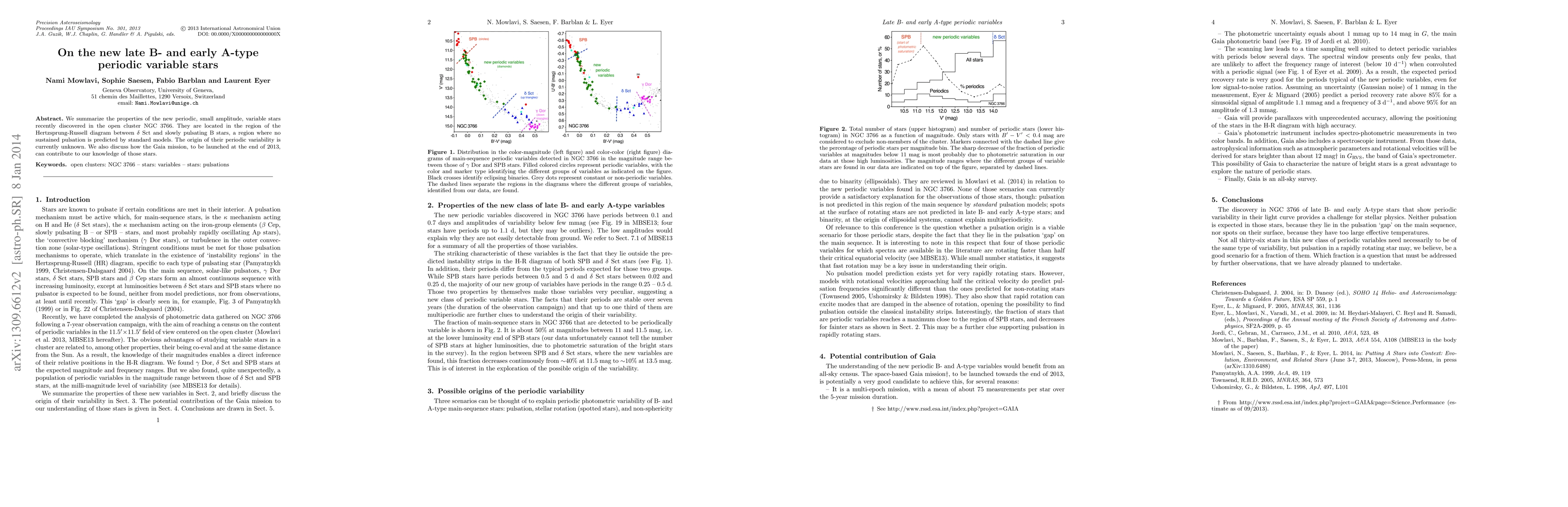 We summarize the properties of the new periodic, small amplitude, variable stars recently discovered in the open cluster NGC 3766. They are located in the region of the Hertzsprung-Russell diagram between \delta\ Sct and slowly pulsating B stars, a region where no sustained pulsation is predicted by standard models. The origin of their periodic variability is currently unknown. We also discuss how the Gaia mission, to be launched at the end of 2013, can contribute to our knowledge of those stars.