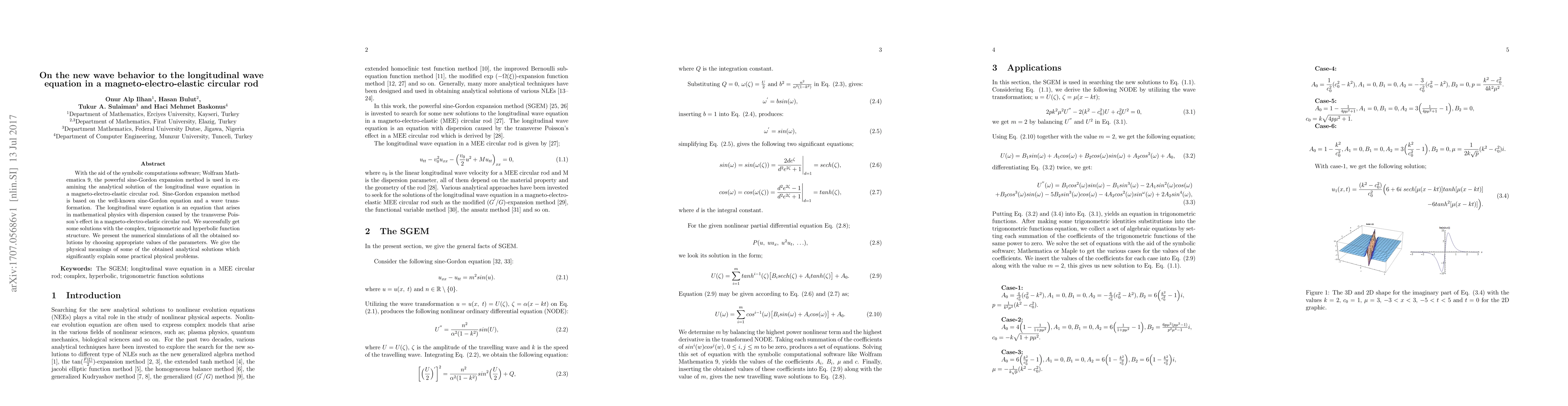 With the aid of the symbolic computations software; Wolfram Mathematica 9, the powerful sine-Gordon expansion method is used in examining the analytical solution of the longitudinal wave equation in a magneto-electro-elastic circular rod. Sine-Gordon expansion method is based on the well-known sine-Gordon equation and a wave transformation. The longitudinal wave equation is an equation that arises in mathematical physics with dispersion caused by the transverse Poisson's effect in a magneto-electro-elastic circular rod. We successfully get some solutions with the complex, trigonometric and hyperbolic function structure. We present the numerical simulations of all the obtained solutions by choosing appropriate values of the parameters. We give the physical meanings of some of the obtained analytical solutions which significantly explain some practical physical problems.