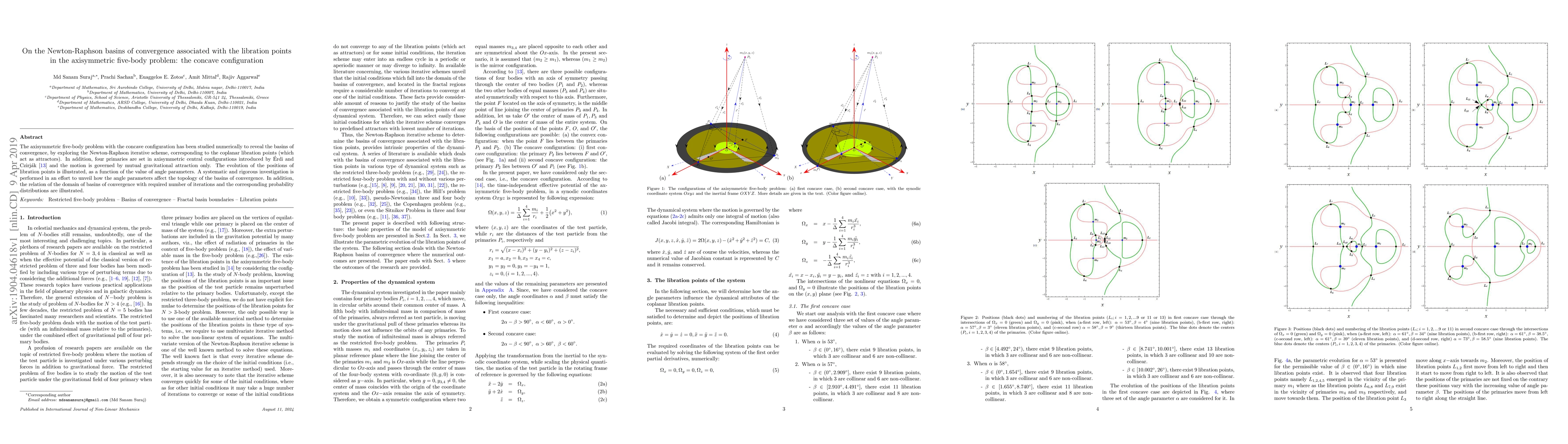 The axisymmetric five-body problem with the concave configuration has been studied numerically to reveal the basins of convergence, by exploring the Newton-Raphson iterative scheme, corresponding to the coplanar libration points (which act as attractors). In addition, four primaries are set in axisymmetric central configurations introduced by \'{E}rdi and Czirj\'{a}k and the motion is governed by mutual gravitational attraction only. The evolution of the positions of libration points is illustrated, as a function of the value of angle parameters. A systematic and rigorous investigation is performed in an effort to unveil how the angle parameters affect the topology of the basins of convergence. In addition, the relation of the domain of basins of convergence with required number of iterations and the corresponding probability distributions are illustrated.