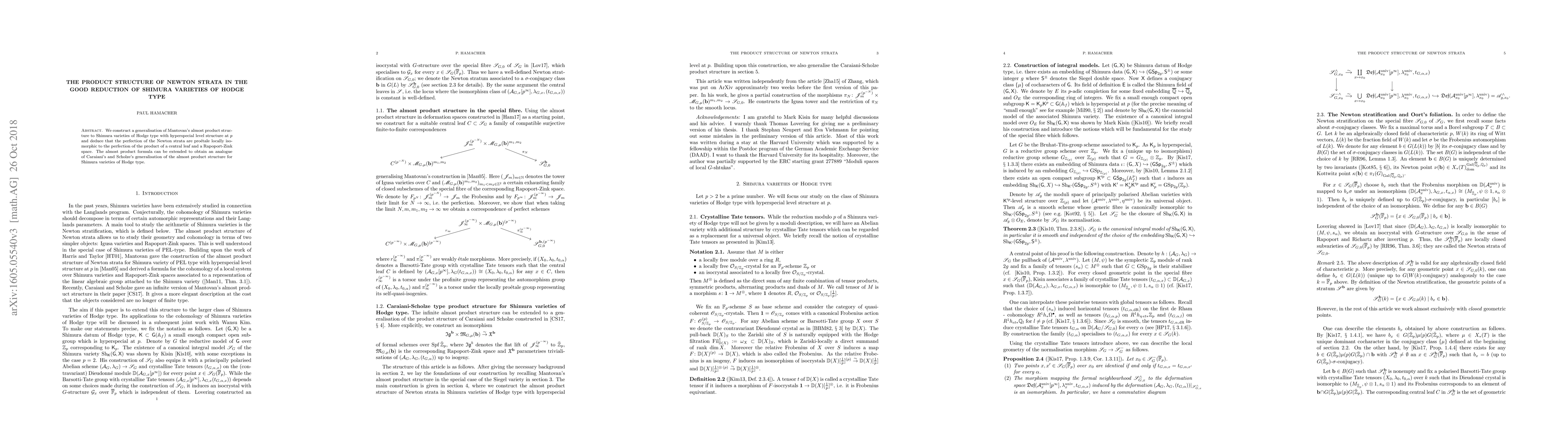I construct a generalisation of Mantovan's almost product structure to Shimura varieties of Hodge type with hyperspecial level structure at $p$ and deduce that the perfection of the Newton strata are pro-\'etale locally isomorphic to the perfection of the product of a central leaf and a Rapoport-Zink space. The almost product formula can be extended to obtain an analogue of Caraiani's and Scholze's generalisation of the almost product structure for Shimura varieties of Hodge type.