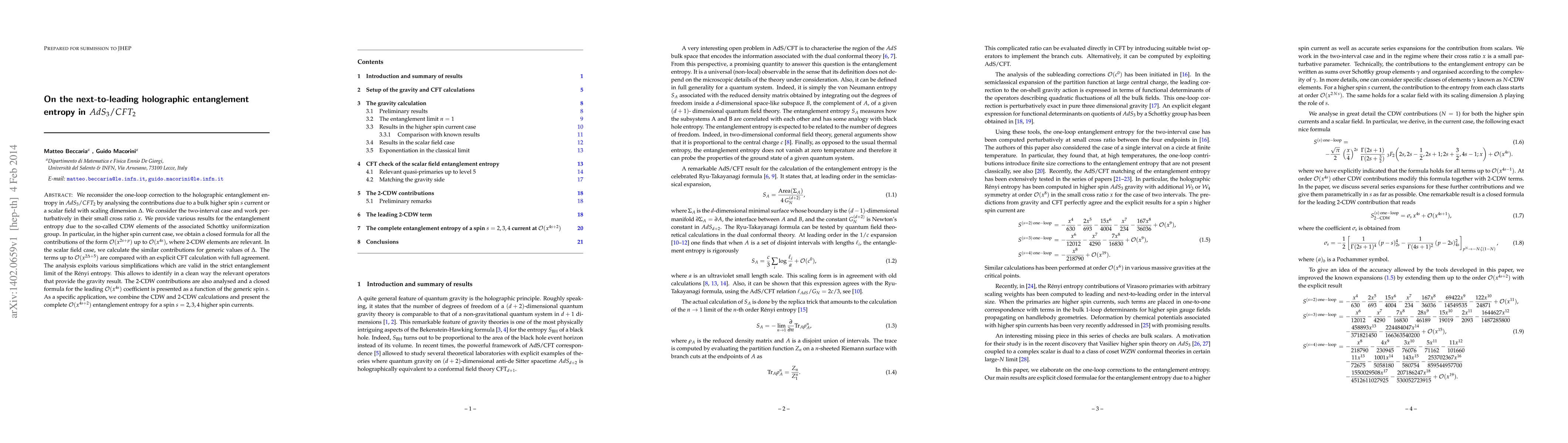 We reconsider the one-loop correction to the holographic entanglement entropy in $AdS_{3}/CFT_{2}$ by analysing the contributions due to a bulk higher spin $s$ current or a scalar field with scaling dimension $\Delta$. We consider the two-interval case and work perturbatively in their small cross ratio $x$. We provide various results for the entanglement entropy due to the so-called CDW elements of the associated Schottky uniformization group. In particular, in the higher spin current case, we obtain a closed formula for all the contributions of the form $\mathcal O(x^{2s+p})$ up to $\mathcal O(x^{4s})$, where 2-CDW elements are relevant. In the scalar field case, we calculate the similar contributions for generic values of $\Delta$. The terms up to $\mathcal O(x^{2\Delta+5})$ are compared with an explicit CFT calculation with full agreement. The analysis exploits various simplifications which are valid in the strict entanglement limit of the R\'enyi entropy. This allows to identify in a clean way the relevant operators that provide the gravity result. The 2-CDW contributions are also analysed and a closed formula for the leading $\mathcal O(x^{4s})$ coefficient is presented as a function of the generic spin $s$. As a specific application, we combine the CDW and 2-CDW calculations and present the complete $\mathcal O(x^{4s+2})$ entanglement entropy for a spin $s=2,3,4$ higher spin current.