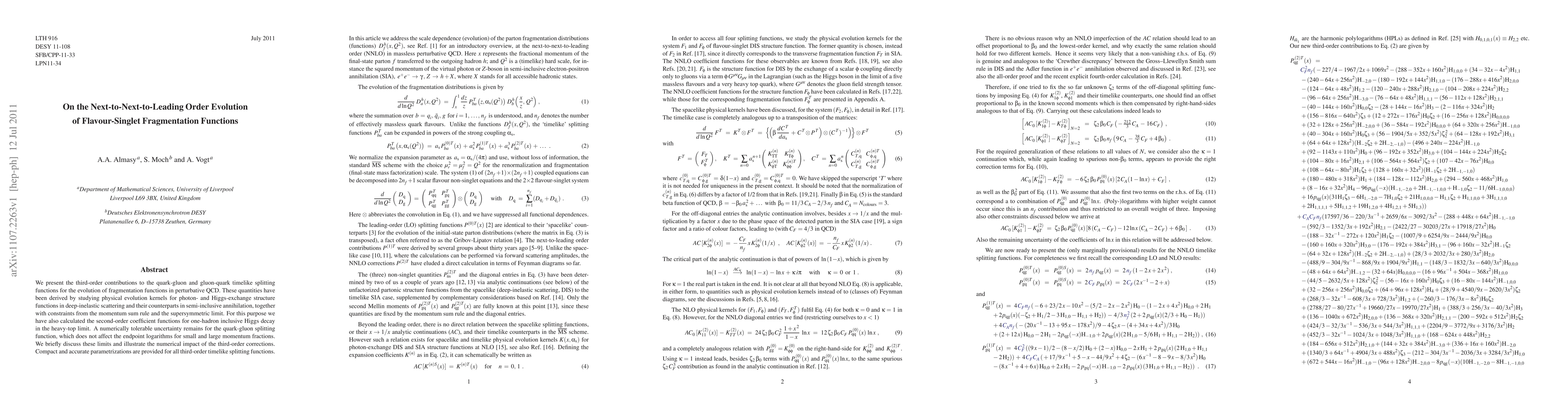 We present the third-order contributions to the quark-gluon and gluon-quark timelike splitting functions for the evolution of fragmentation functions in perturbative QCD. These quantities have been derived by studying physical evolution kernels for photon- and Higgs-exchange structure functions in deep inelastic scattering and their counterparts in semi-inclusive annihilation, together with constraints from the momentum sum rule and the supersymmetric limit. For this purpose we have also calculated the second-order coefficient functions for one-hadron inclusive Higgs decay in the heavy-top limit. A numerically tolerable uncertainty remains for the quark-gluon splitting function, which does not affect the endpoint logarithms for small and large momentum fractions. We briefly discuss these limits and illustrate the numerical impact of the third-order corrections. Compact and accurate parametrizations are provided for all third-order timelike splitting functions.