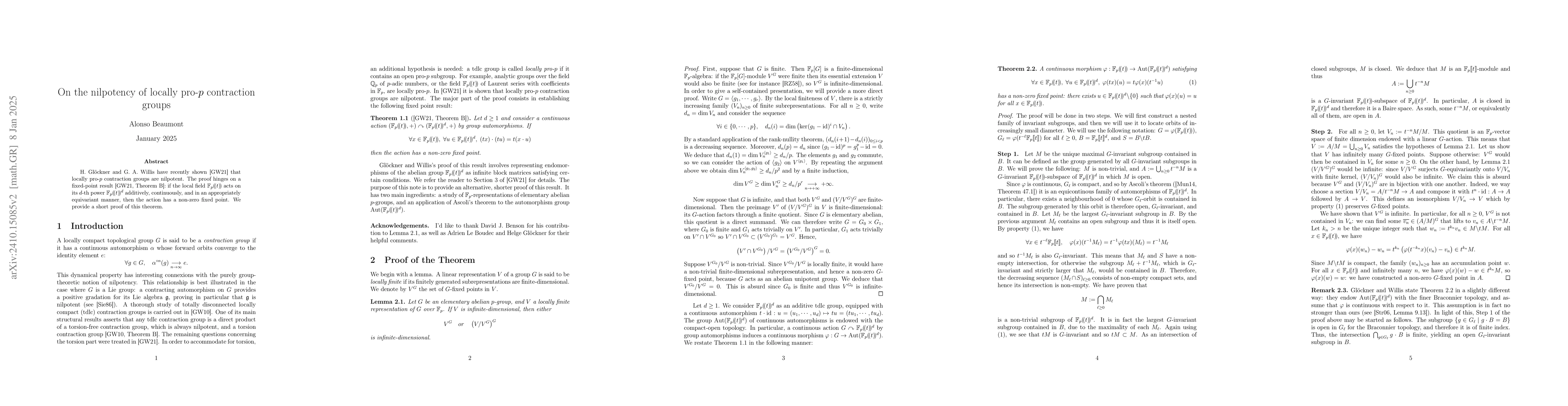 H. Gl\"ockner and G. A. Willis have recently shown that locally pro-p contraction groups are nilpotent. The proof hinges on a fixed-point result: if the local field $\mathbb{F}_{p}(\!(t)\!)$ acts on its $d$-th power $\mathbb{F}_{p}(\!(t)\!)^{d}$ additively, continuously, and in an appropriately equivariant manner, then the action has a non-zero fixed point. We provide a short proof of this theorem.