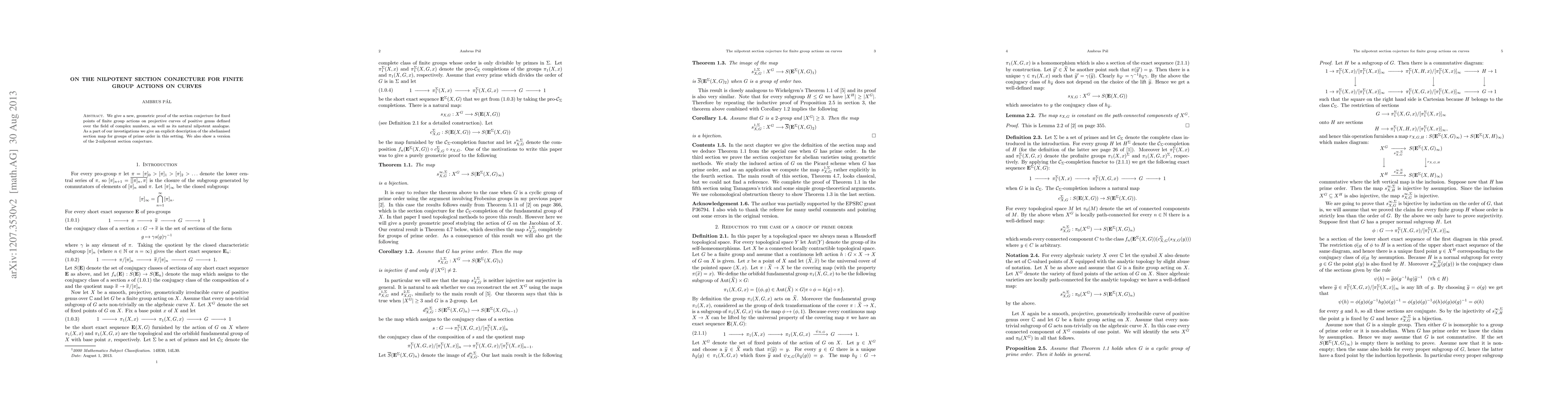 This paper presents a geometric proof for the section conjecture in finite group actions on projective curves over complex numbers, along with its nilpotent analogue. Additionally, it provides an explicit description of the abelianised section map for groups of prime order and verifies a version of the 2-nilpotent section conjecture.