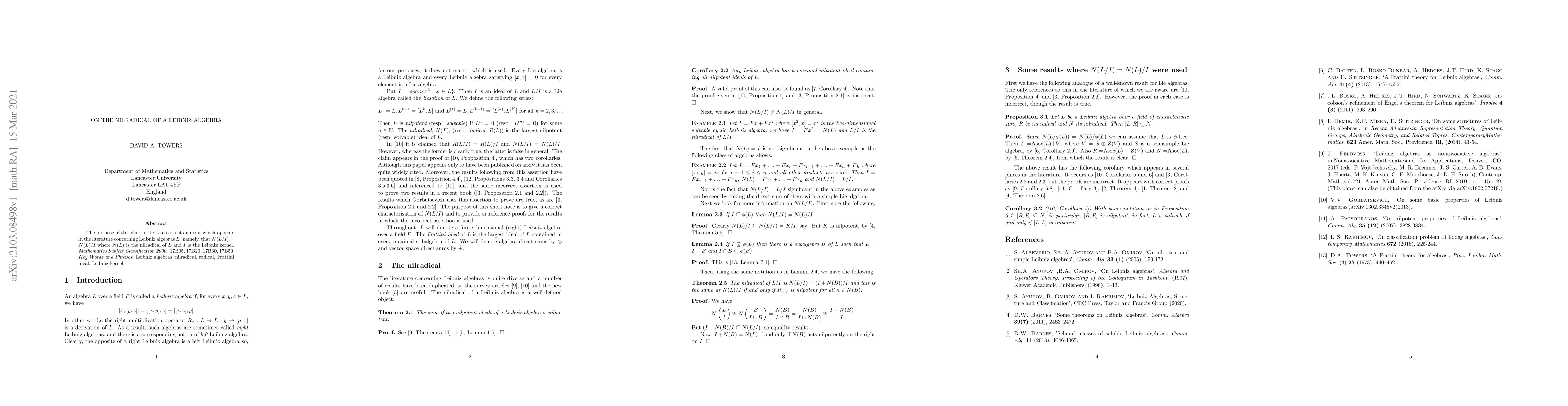 The purpose of this short note is to correct an error which appears in the literature concerning Leibniz algebras $L$: namely, that $N(L/I)=N(L)/I$ where $N(L)$ is the nilradical of $L$ and $I$ is the Leibniz kernel.
