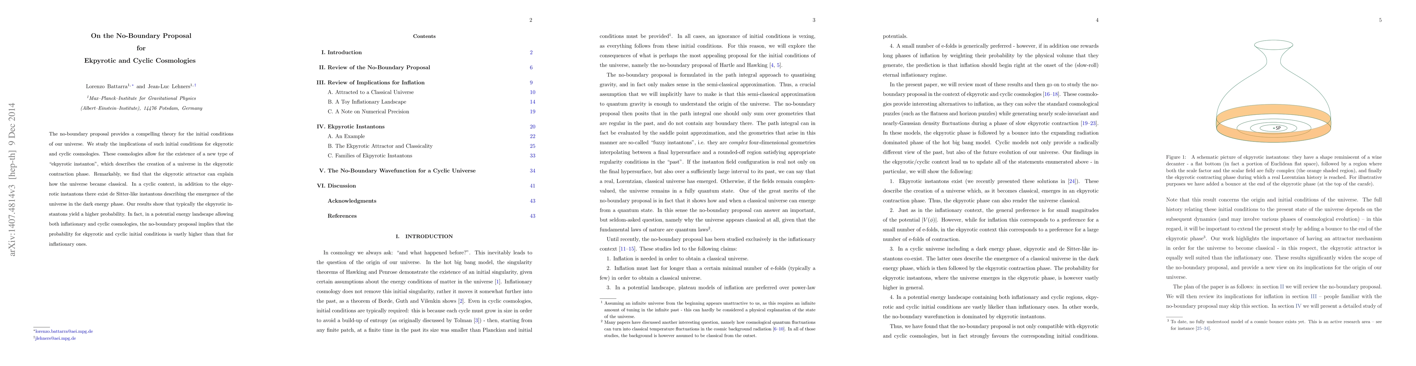 The no-boundary proposal suggests a novel theory for the universe's initial conditions, revealing significant implications for ekpyrotic and cyclic cosmologies, including the emergence of ekpyrotic and de Sitter-like instantons, with ekpyrotic instantons typically having a higher probability.