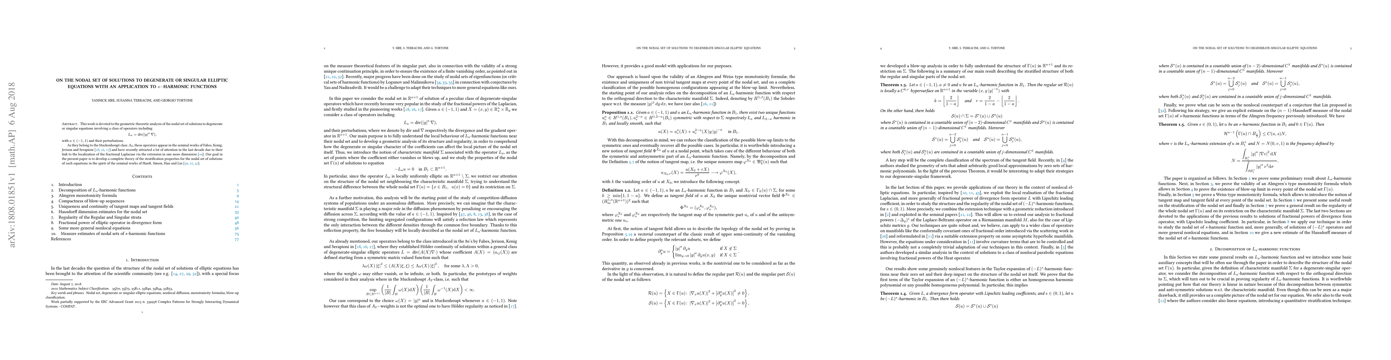 This work is devoted to the geometric-theoretic analysis of the nodal set of solutions to degenerate or singular equations involving a class of operators including $$ L_a = \mbox{div}(\abs{y}^a \nabla), $$ with $a\in(-1,1)$ and their perturbations. As they belong to the Muckenhoupt class $A_2$, these operators appear in the seminal works of Fabes, Kenig, Jerison and Serapioni \cite{fkj,fjk2,fks} and have recently attracted a lot of attention in the last decade due to their link to the localization of the fractional Laplacian via the extension in one more dimension \cite{CS2007}. Our goal in the present paper is to develop a complete theory of the stratification properties for the nodal set of solutions of such equations in the spirit of the seminal works of Hardt, Simon, Han and Lin \cite{MR1010169,MR1305956,MR1090434}.