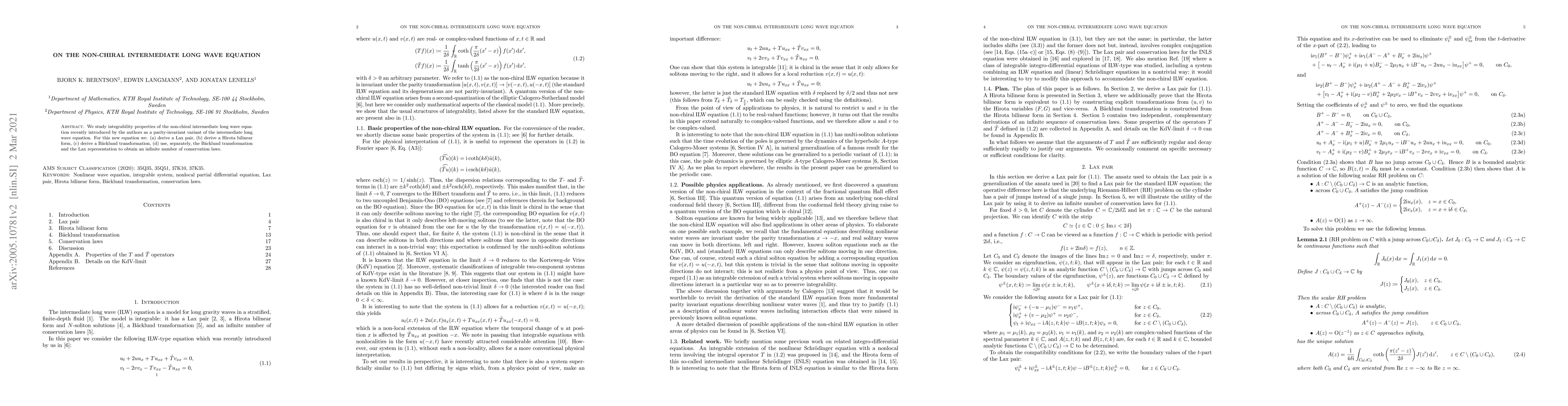 Researchers derived integrability properties for the non-chiral intermediate long wave equation, including Lax pairs, Hirota bilinear forms, B"{a}cklund transformations, and an infinite number of conservation laws.