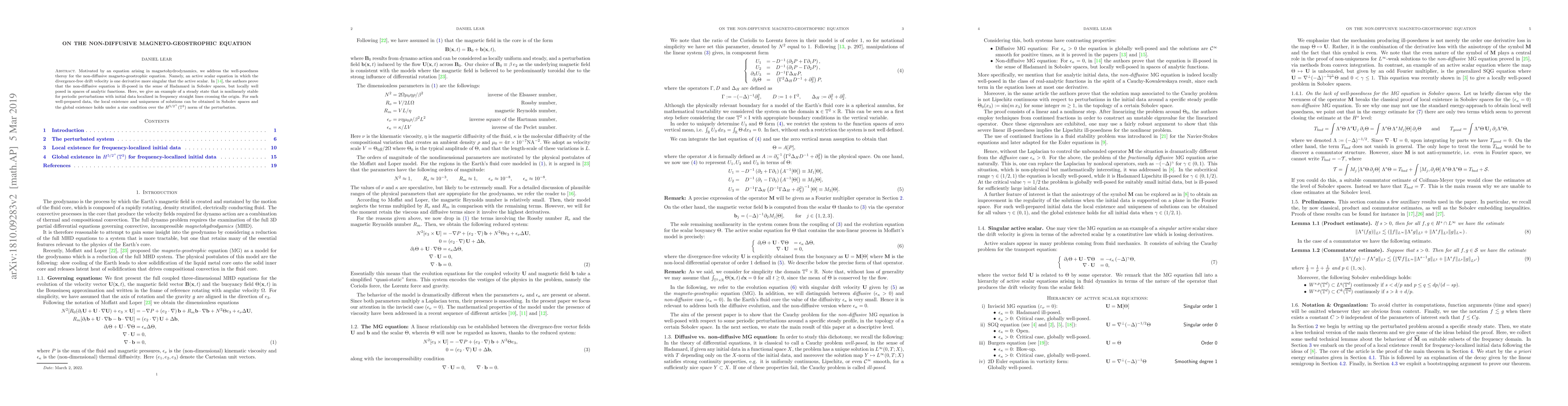 Motivated by an equation arising in magnetohydrodynamics, we address the well-posedness theroy for the non-diffusive magneto-geostrophic equation. Namely, an active scalar equation in which the divergence-free drift velocity is one derivative more singular that the active scalar. In \cite{Friedlander-Vicol_3}, the authors prove that the non-diffusive equation is ill-posed in the sense of Hadamard in Sobolev spaces, but locally well posed in spaces of analytic functions. Here, we give an example of a steady state that is nonlinearly stable for periodic perturbations with initial data localized in frequency straight lines crossing the origin. For such well-prepared data, the local existence and uniqueness of solutions can be obtained in Sobolev spaces and the global existence holds under a size condition over the $H^{5/2^{+}}(\mathbb{T}^3)$ norm of the perturbation.
