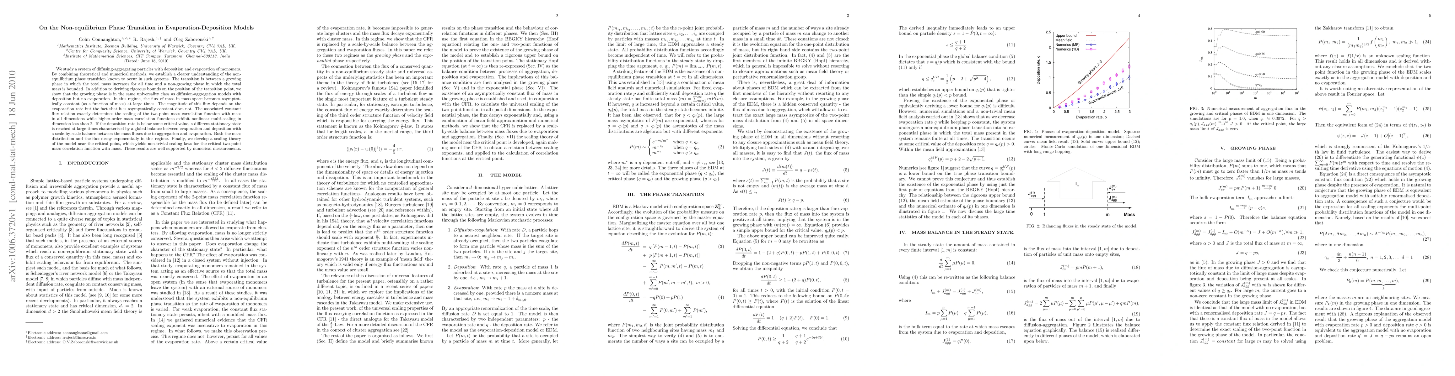 We study a system of diffusing-aggregating particles with deposition and evaporation of monomers. By combining theoretical and numerical methods, we establish a clearer understanding of the non-equilibrium phase transition known to occur in such systems. The transition is between a growing phase in which the total mass increases for all time and a non-growing phase in which the total mass is bounded. In addition to deriving rigorous bounds on the position of the transition point, we show that the growing phase is in the same universality class as diffusion-aggregation models with deposition but no evaporation. In this regime, the flux of mass in mass space becomes asymptotically constant (as a function of mass) at large times. The magnitude of this flux depends on the evaporation rate but the fact that it is asymptotically constant does not. The associated constant flux relation exactly determines the scaling of the two-point mass correlation function with mass in all dimensions while higher-order mass correlation functions exhibit nonlinear multi-scaling in dimension less than 2. If the deposition rate is below some critical value, a different stationary state is reached at large times characterised by a global balance between evaporation and deposition with a scale-by-scale balance between the mass fluxes due to aggregation and evaporation. Both the mass distribution and the flux decay exponentially in this regime. Finally, we develop a scaling theory of the model near the critical point, which yields non-trivial scaling laws for the critical two-point mass correlation function with mass. These results are well supported by numerical measurements.