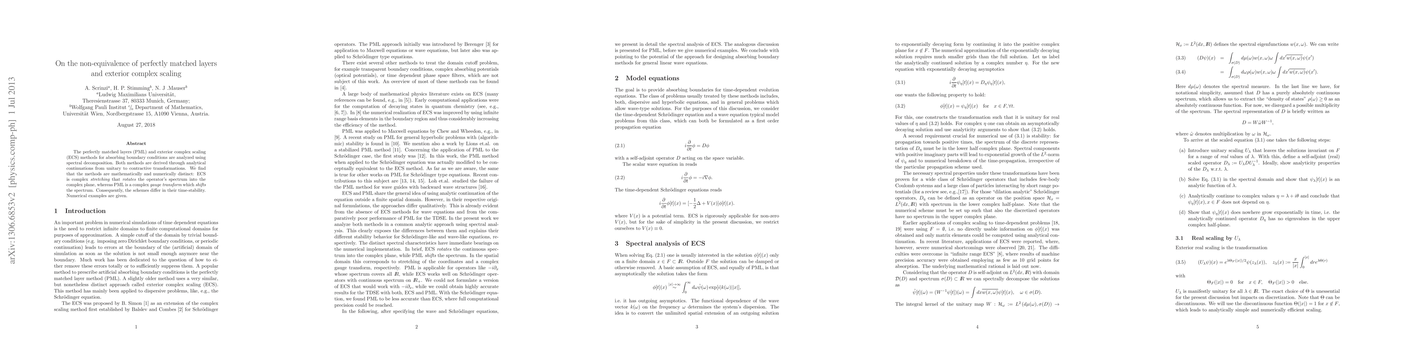 The paper compares perfectly matched layers (PML) and exterior complex scaling (ECS) methods for absorbing boundary conditions, revealing that they are mathematically and numerically distinct due to their different spectral transformations, leading to differences in time-stability. Numerical examples illustrate these distinctions.