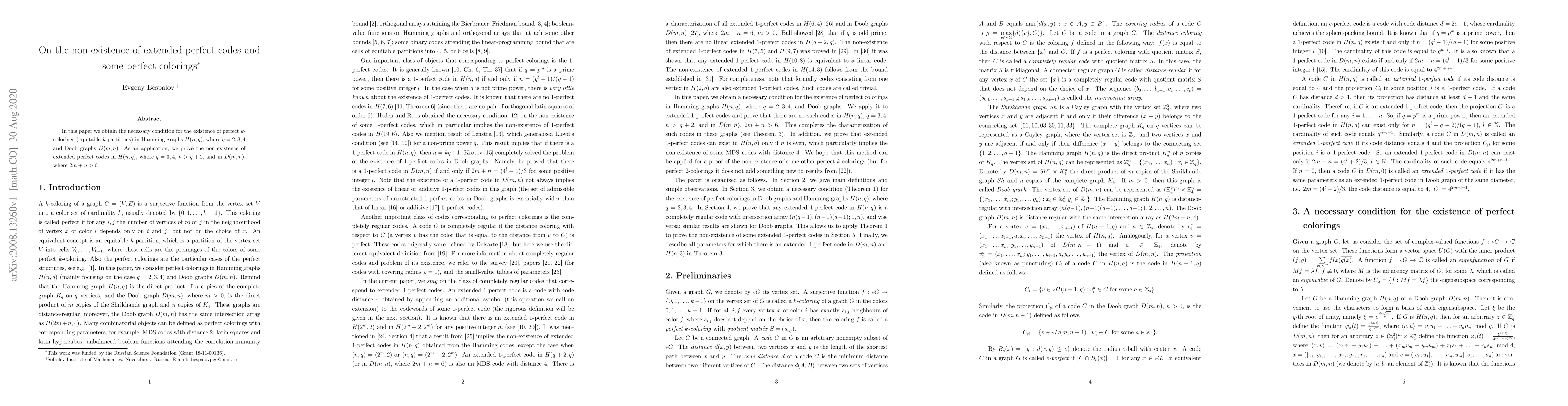 This paper establishes a necessary condition for the existence of perfect $k$-colorings in Hamming graphs $H(n,q)$ and Doob graphs $D(m,n)$, leading to the proof that extended perfect codes do not exist in specified configurations of these graphs.